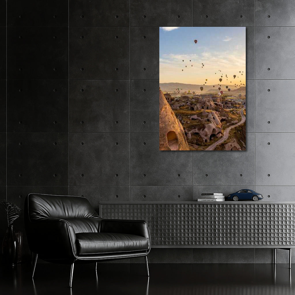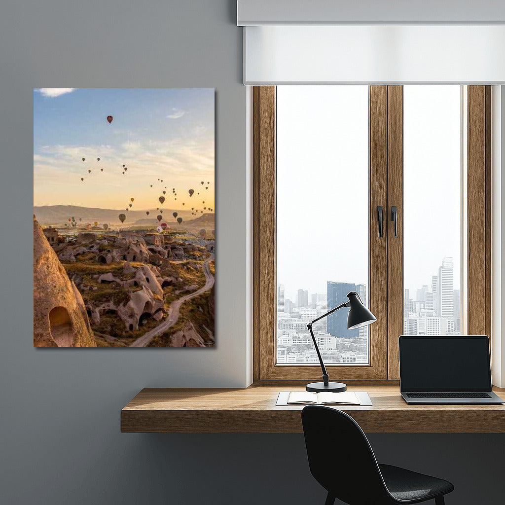 Magical flight of hot air balloons over the landscape of Cappadocia. This painting is moments of Turkey on your wall. Wall art. See more from the collection: Country Art