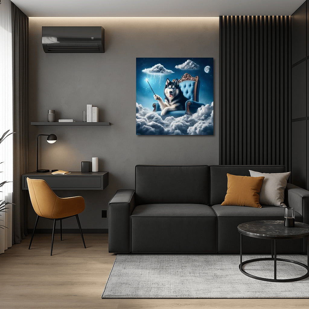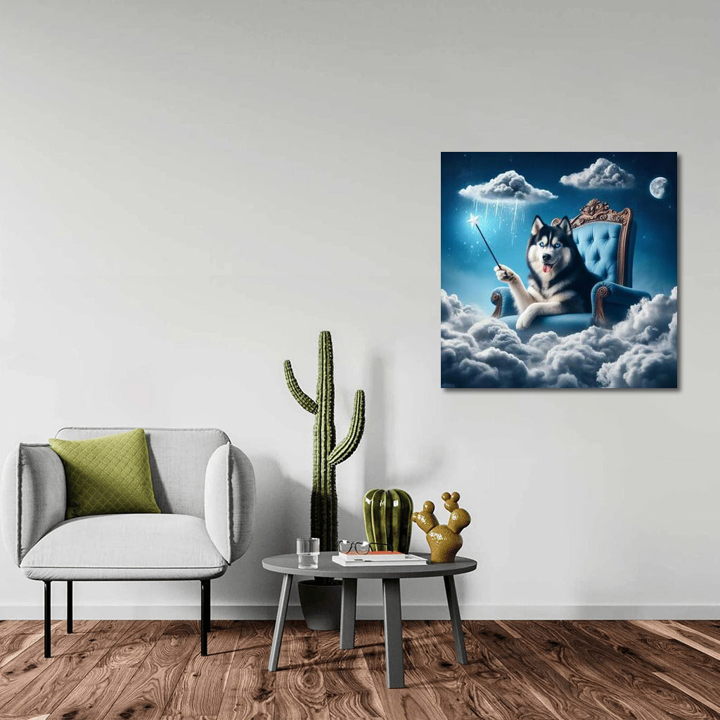 Poster: Siberian Husky on a cloud throne controls the weather with a magic wand. Wall art with elements of fantasy and magic! See more from the collection: Animals Art
