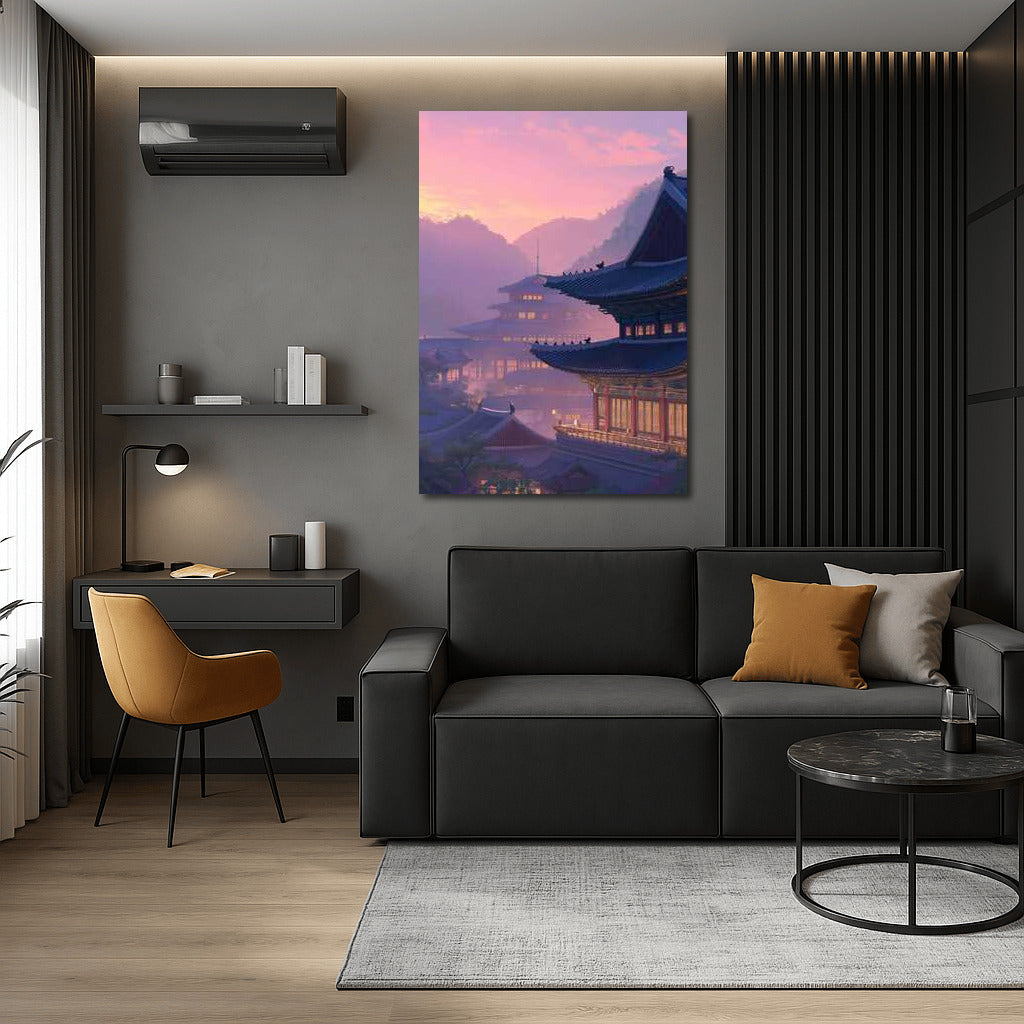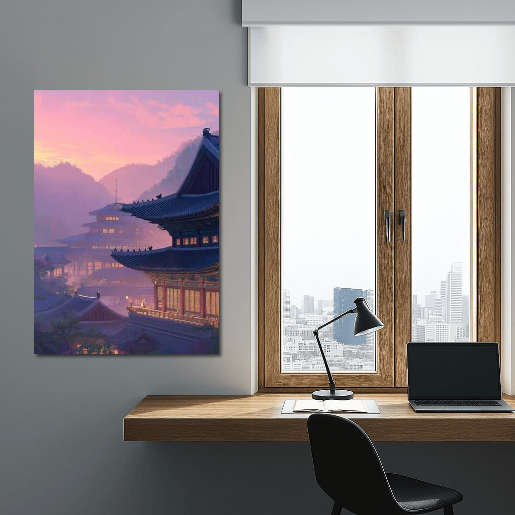 A magical sunrise over traditional pagodas in South Korea. This poster will bring harmony and style to your space. See more from the collection: Country Art