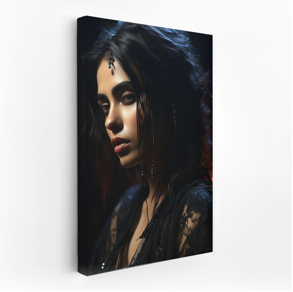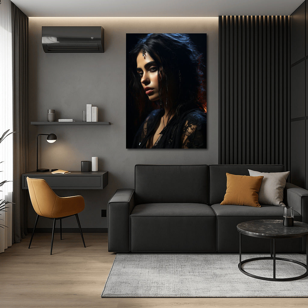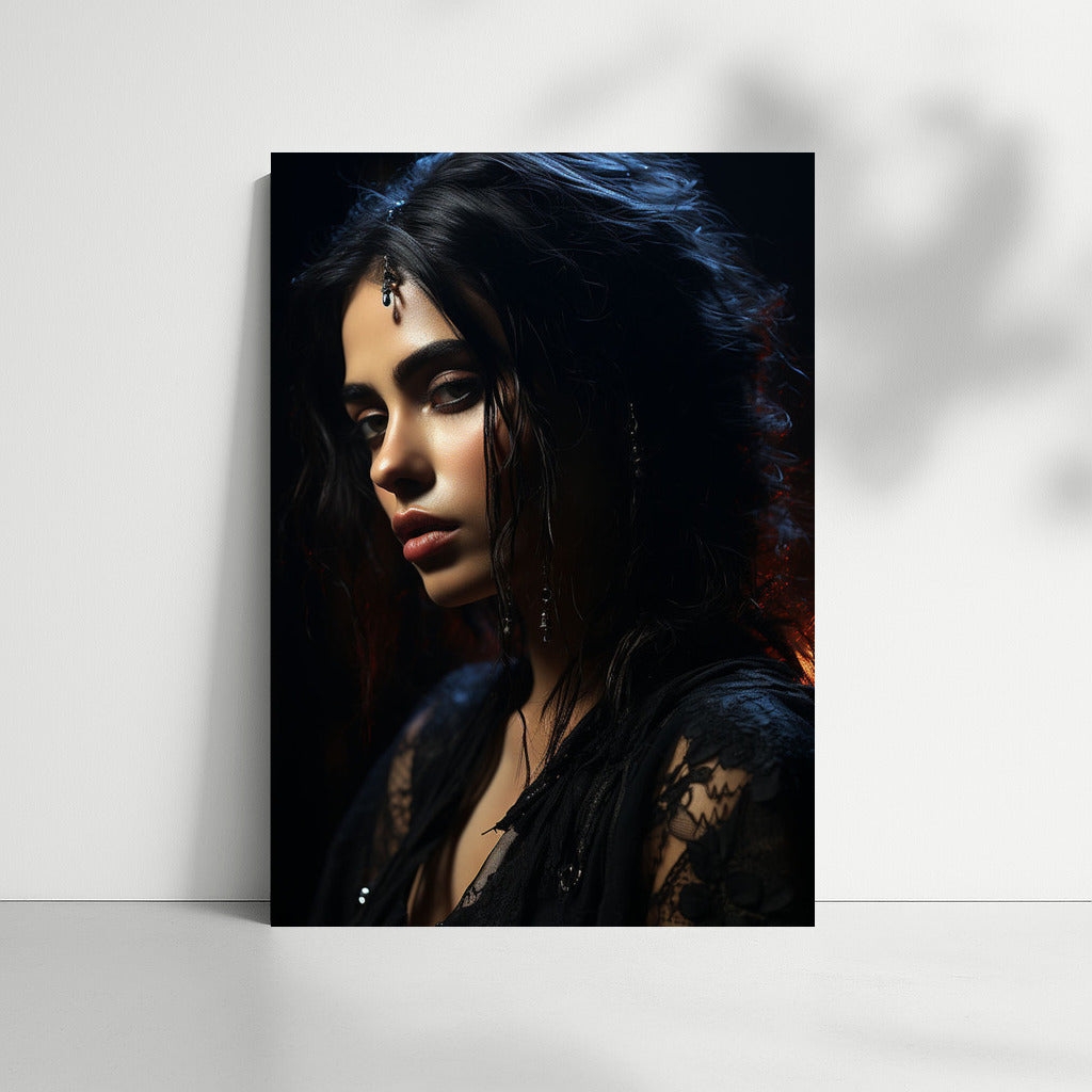 A deep dive into the gaze: Portrait of a Powerful Brunette poster. Wall art full of mysterious power. See more from the collection: Wall Art with Women