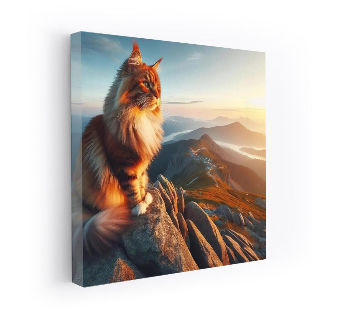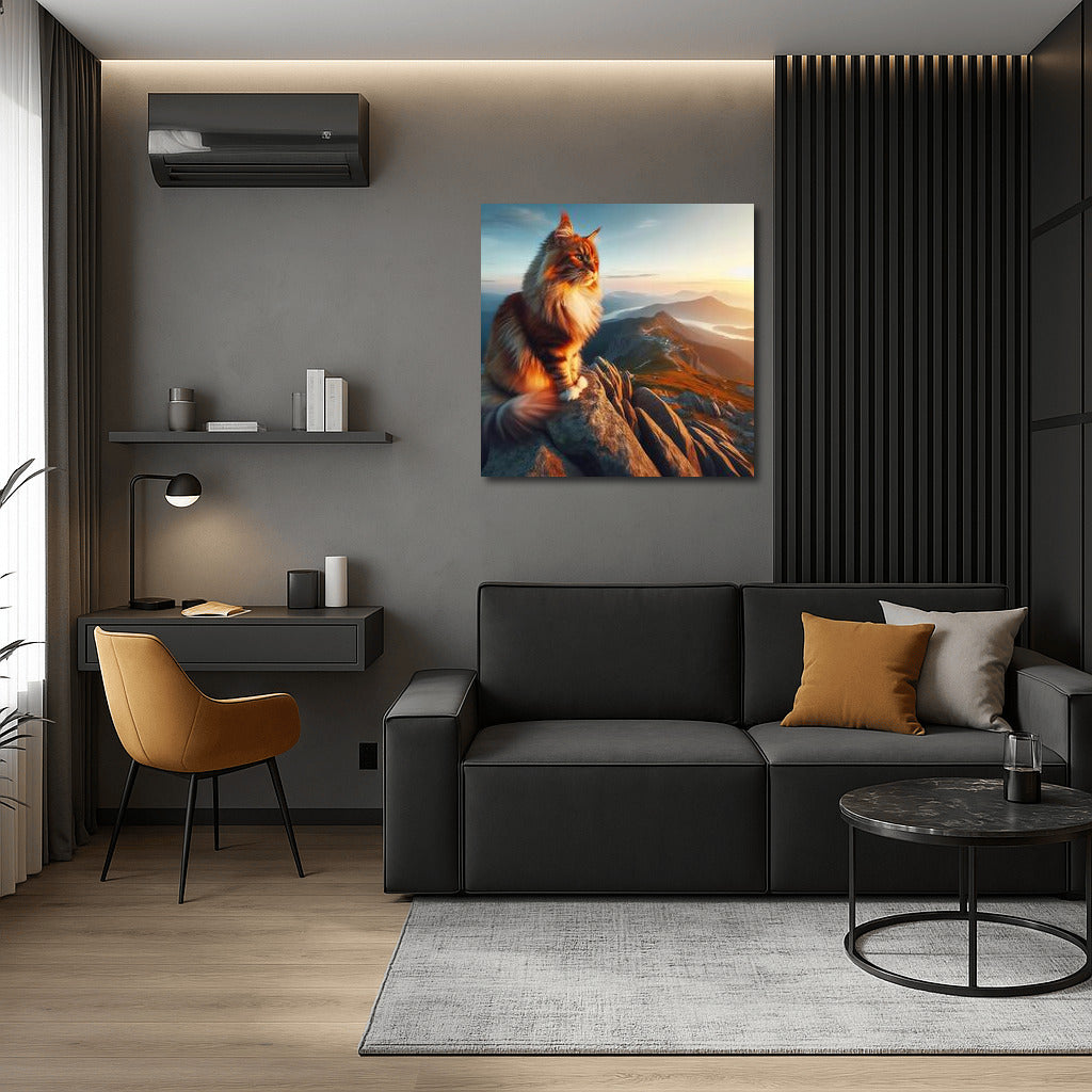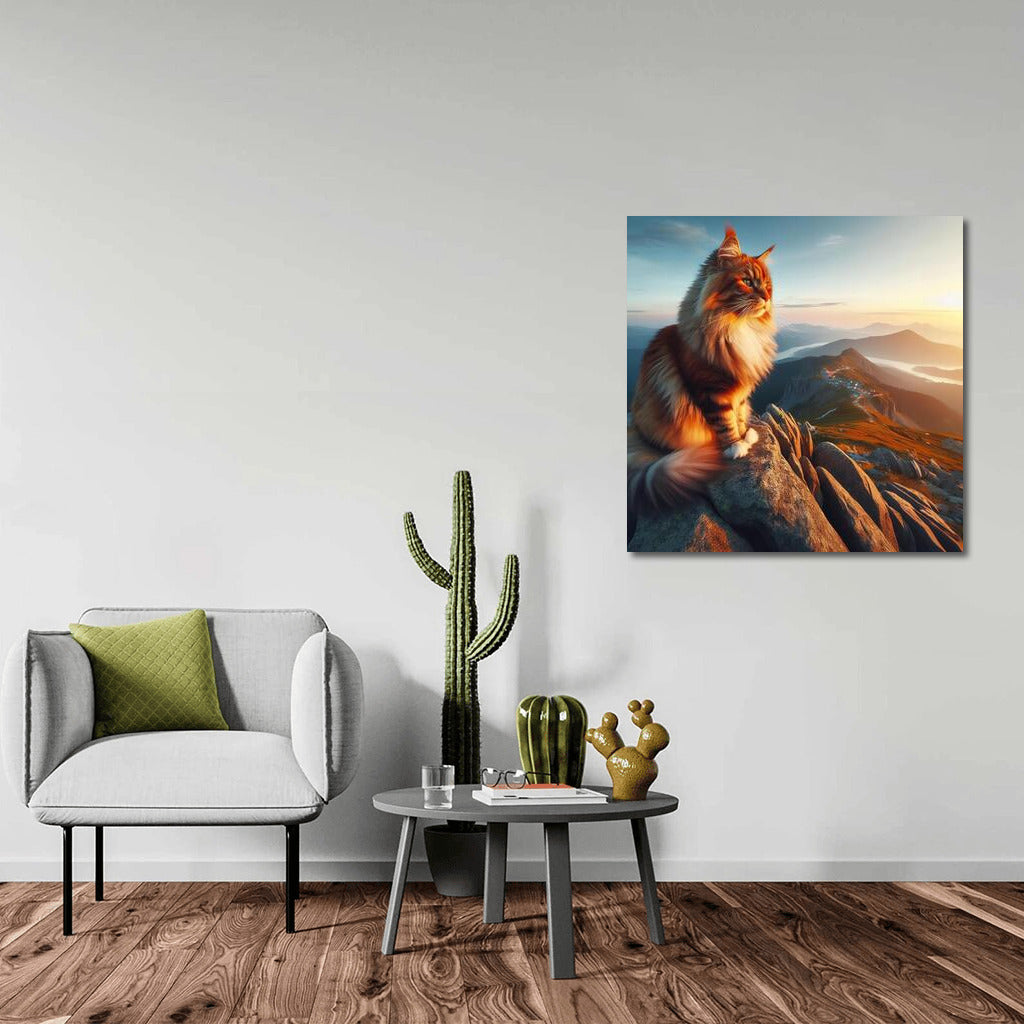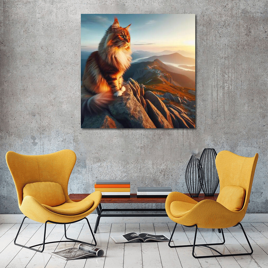 Unique poster: Maine Coon on top of a mountain enjoying the view. Inspirational wall art for your space! See more from the collection: Animals Art