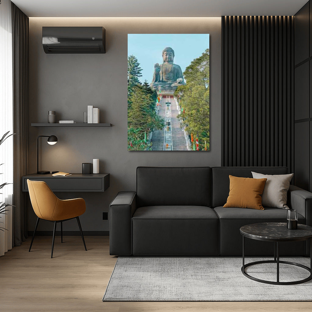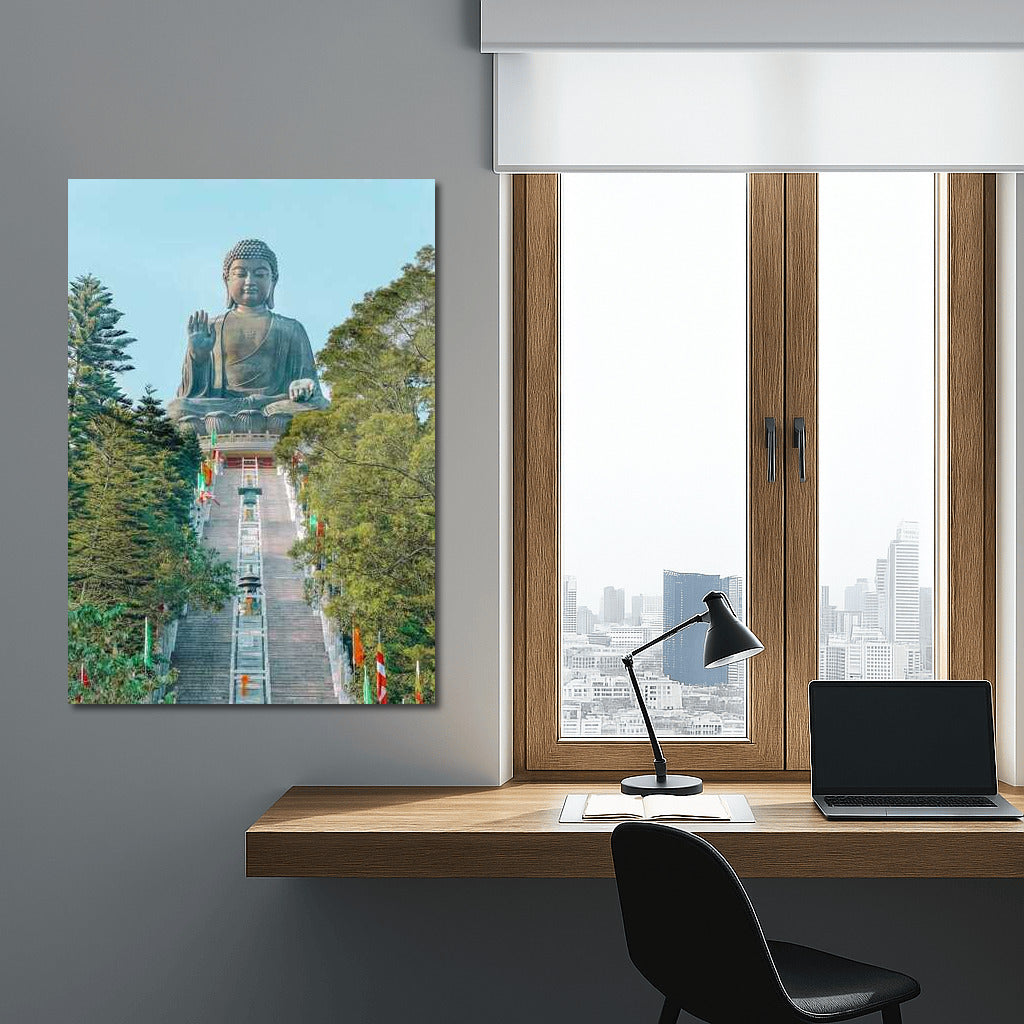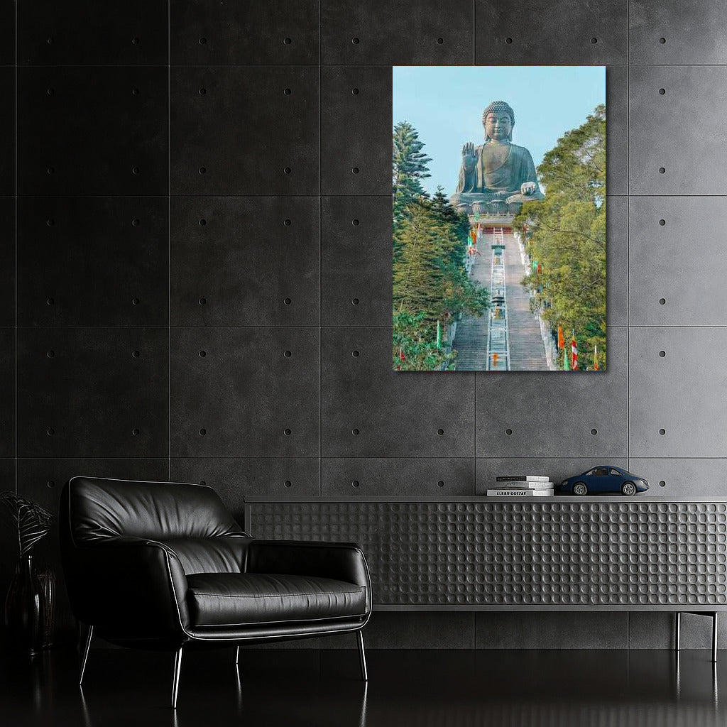 Inspiration from China: a majestic Buddha statue among greenery. This poster will add harmony and tranquility to your interior. See more from the collection: China Art