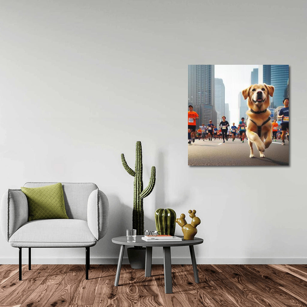 An energetic poster featuring a dog at the center of the marathon, with surrounding runners and city skyscrapers creating a dynamic atmosphere. See more from the collection: Animals Art