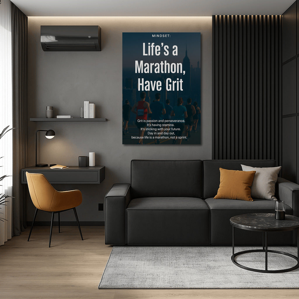 A poster of runners in the light of dawn reminds us: Life's a Marathon, Have Grit. Wall art for motivation and resilience. See more from the collection: Inspirational & Motivational Quotes Art