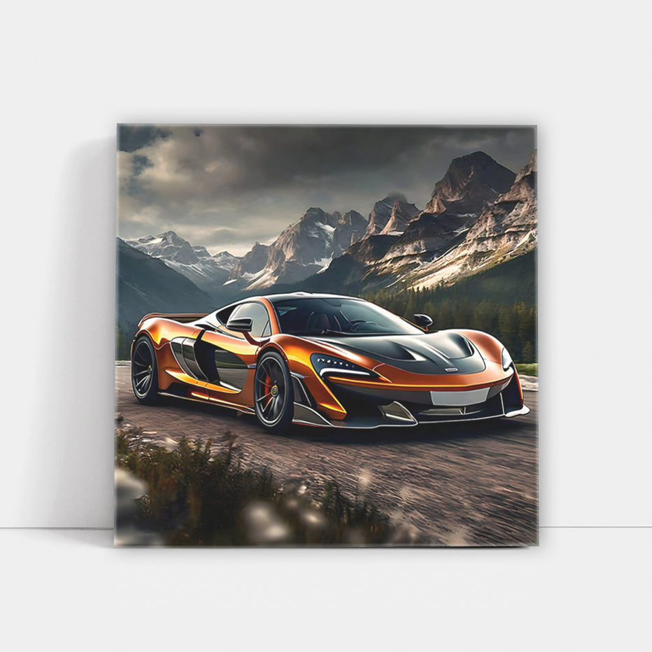 This painting is pure adrenaline! McLaren against the backdrop of mountains, as if he came from a poster. Wall art for those who live for speed. This file is a piece of heaven for car fans, rushing towards you on the wall like a bolide on the finish line. See more from the collection: McLaren Art