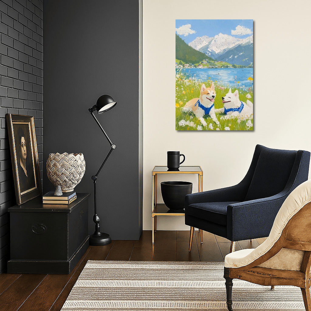 Two happy dogs in a blooming meadow by the lake. Wall art that brings joy and peace to your home. See more from the collection: Animals Art