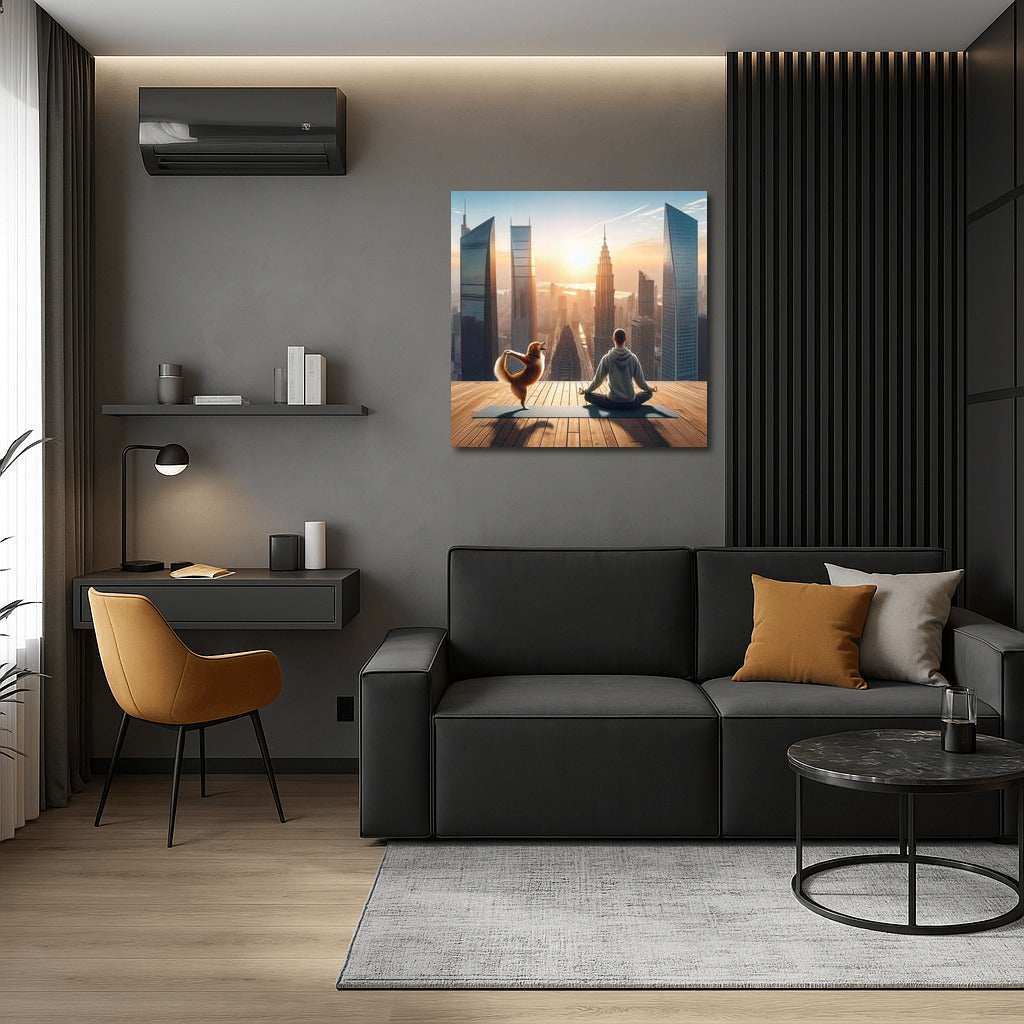 Immerse yourself in the harmony of the metropolis: a poster with a meditating hero and a cheerful dog against the backdrop of majestic skyscrapers. See more from the collection: Animals Art