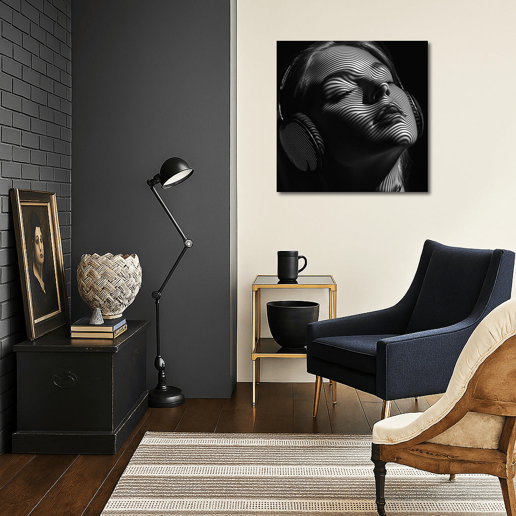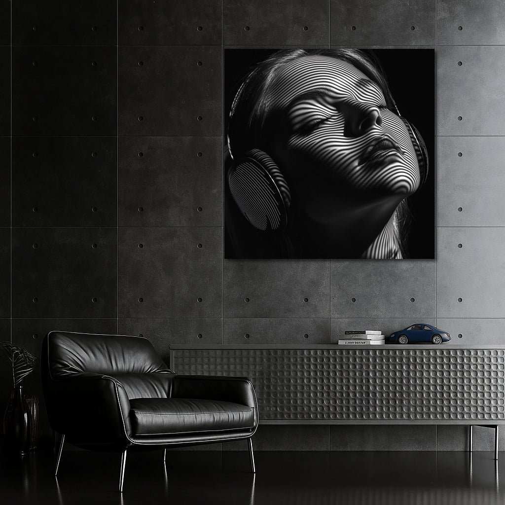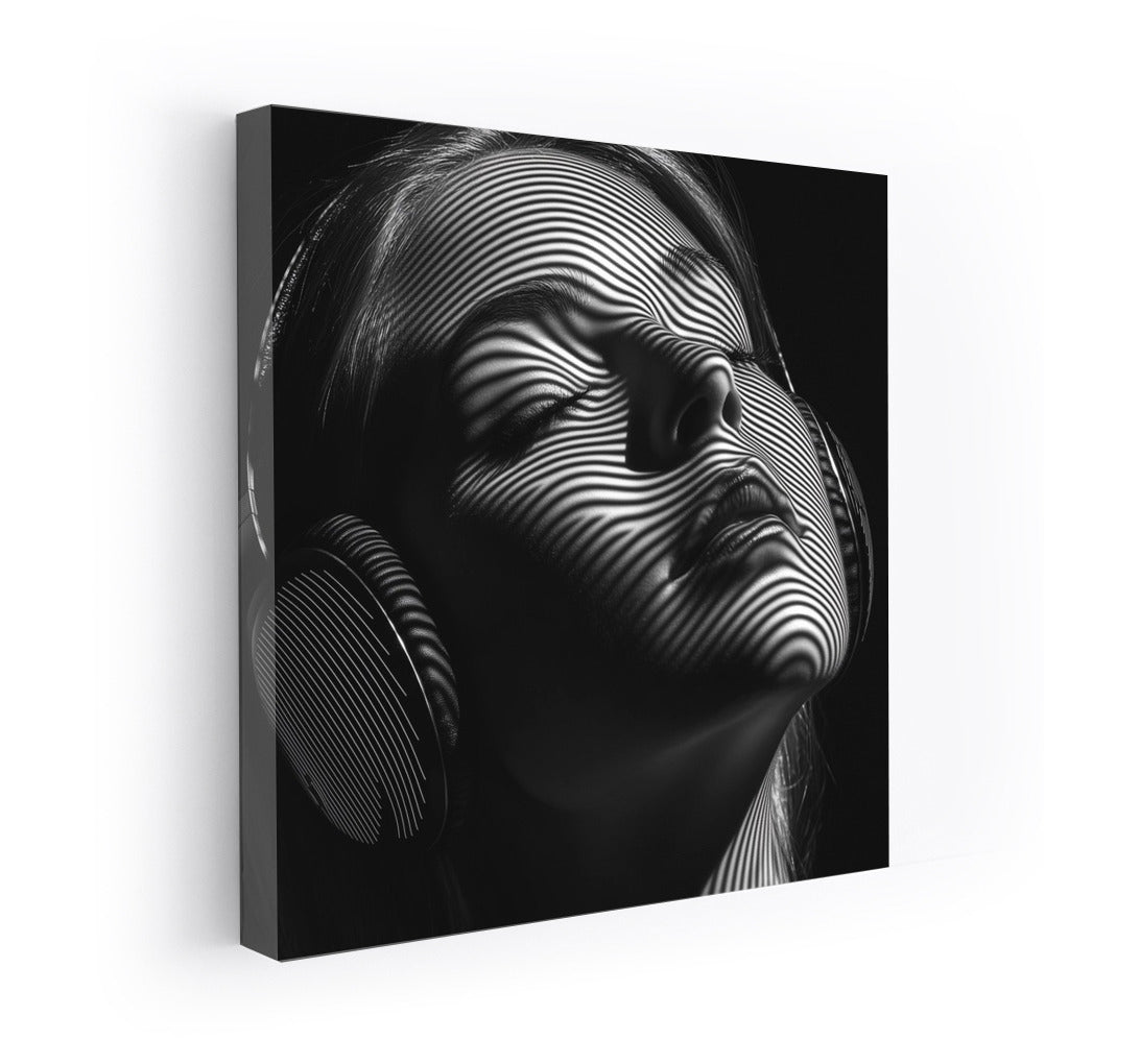 Immerse yourself in a world of sounds and light with this painting. Black and white wall art with a girl in headphones, filled with rhythm. See more from the collection: Black and White Art