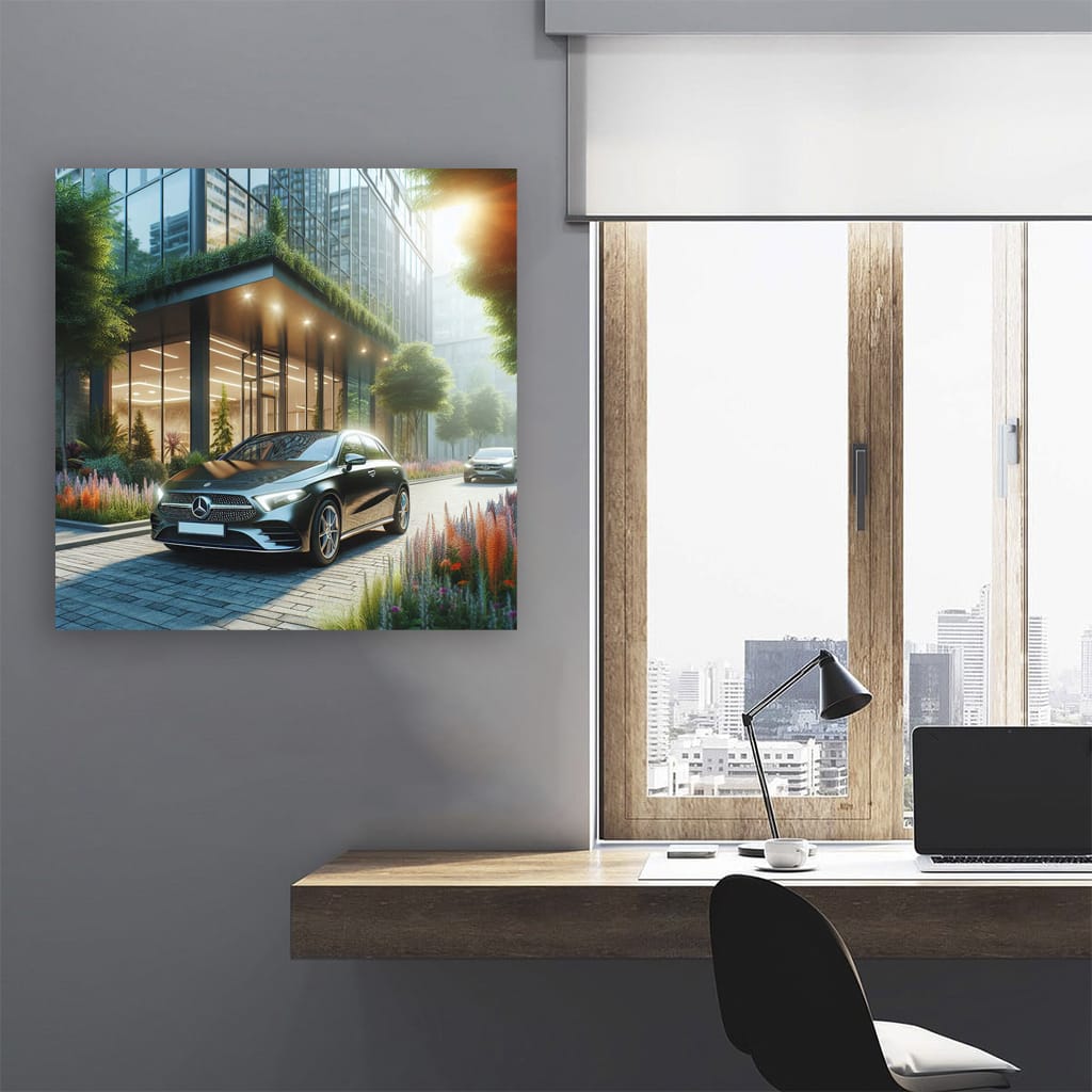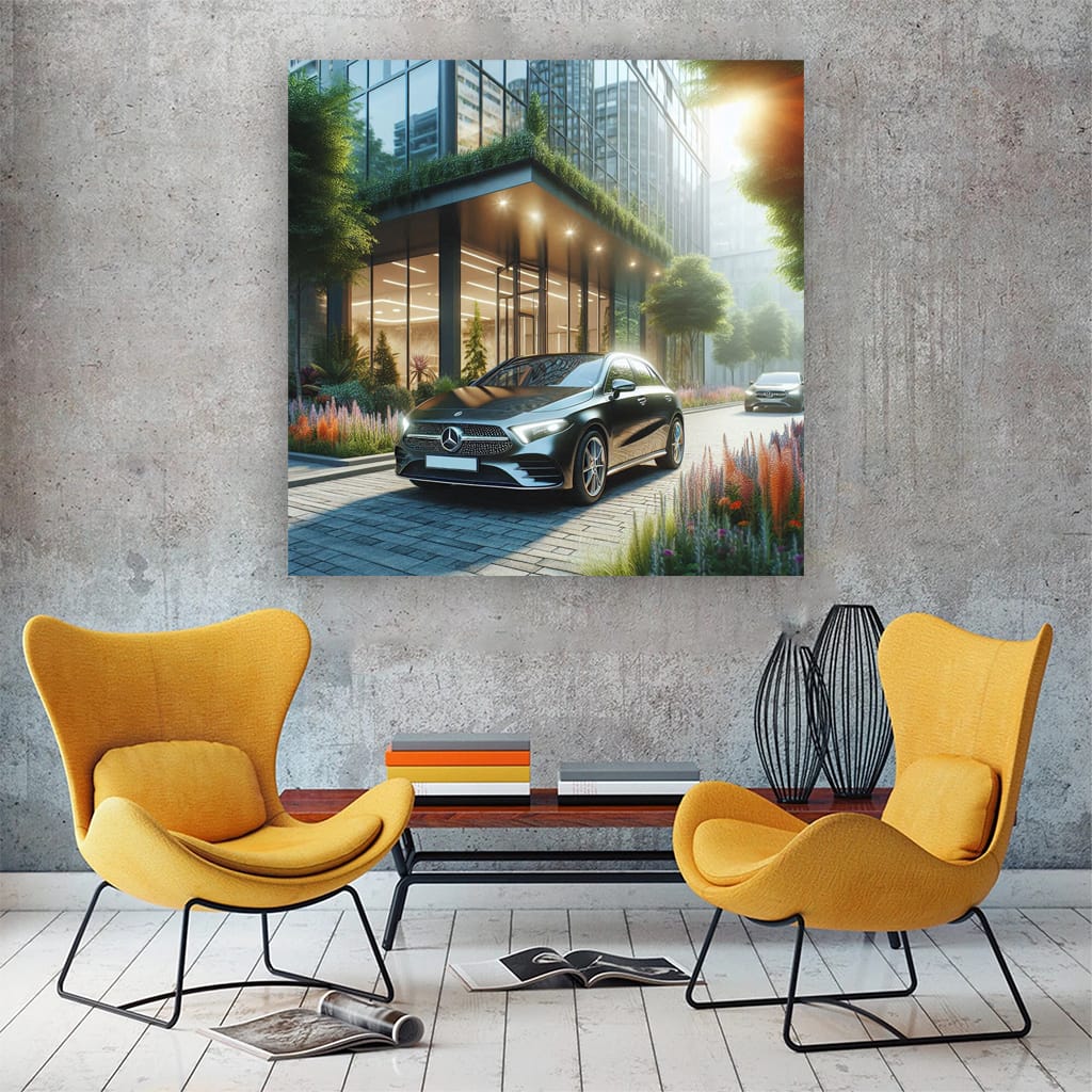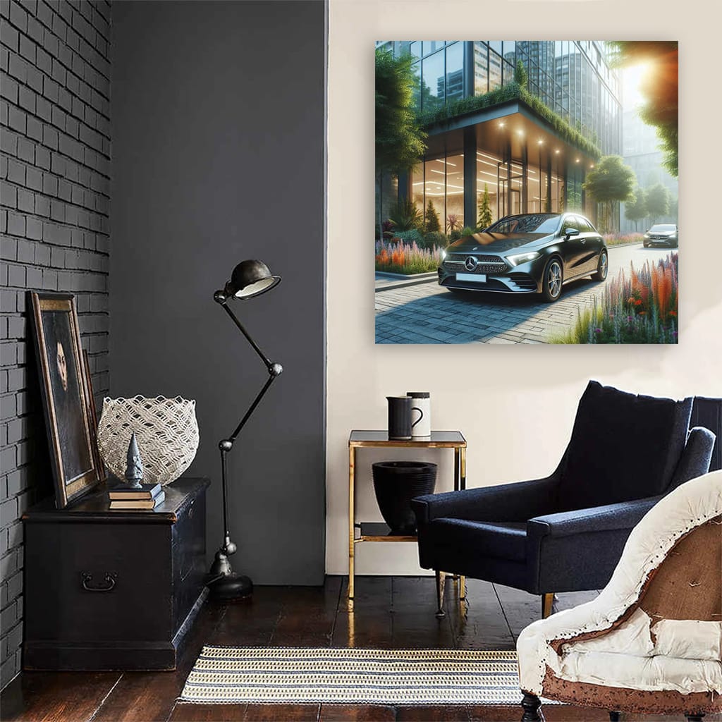 This poster is an explosive mix of style and speed. The painting of the Mercedes A-class against the backdrop of a new building is not just wall art, it is the embodiment of every car fan's dream. The perfect balance of boldness and elegance in one frame. See more from the collection: Mercedes Art