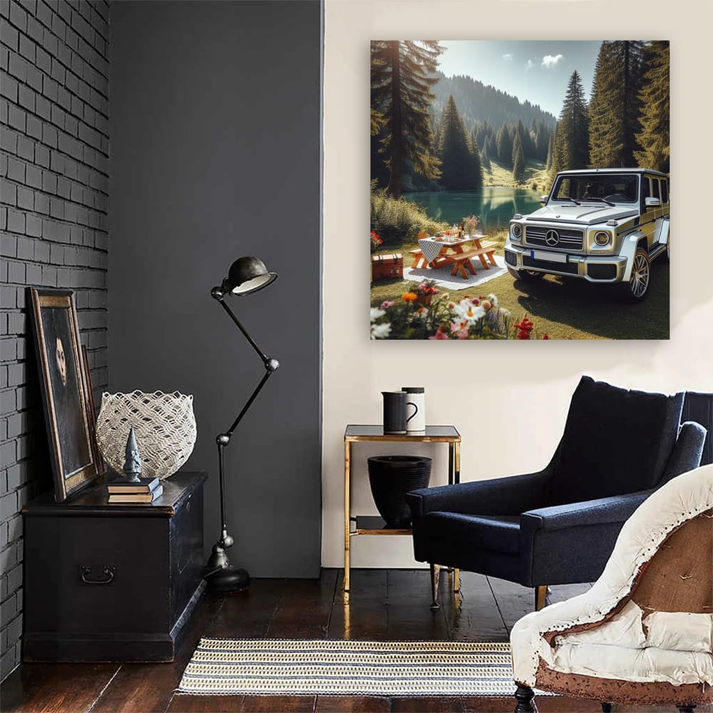 This painting is not just a poster on the wall, it is a manifesto of brutality! Gelik against the backdrop of a lake is every fan's dream. Wall art for those who value power and style. Such art gives the room character and screams about your love for cars. See more from the collection: Mercedes Art