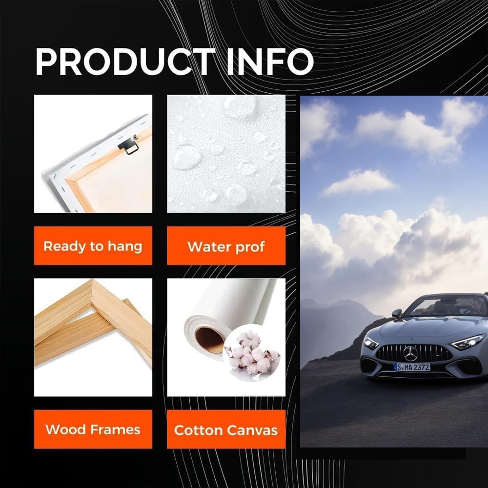 This painting is pure magic for car lovers! It shows a Mercedes SL 43, as if it has escaped from the mountain captivity. Wall art for those who appreciate speed and style. A poster with this beast is a must-have for the garage. This is not just a car, it is a legend! See more from the collection: Mercedes Art