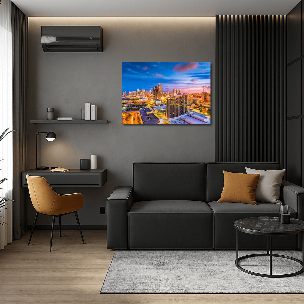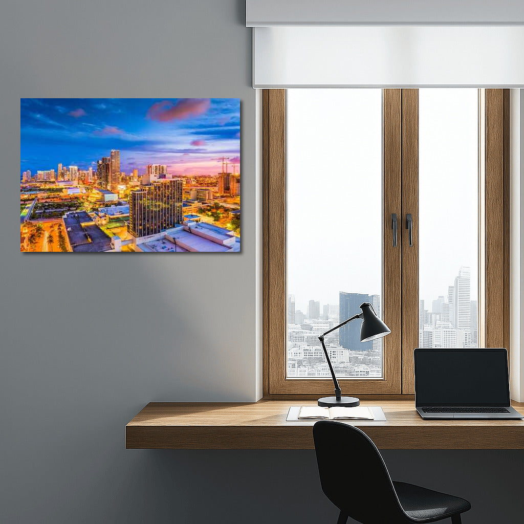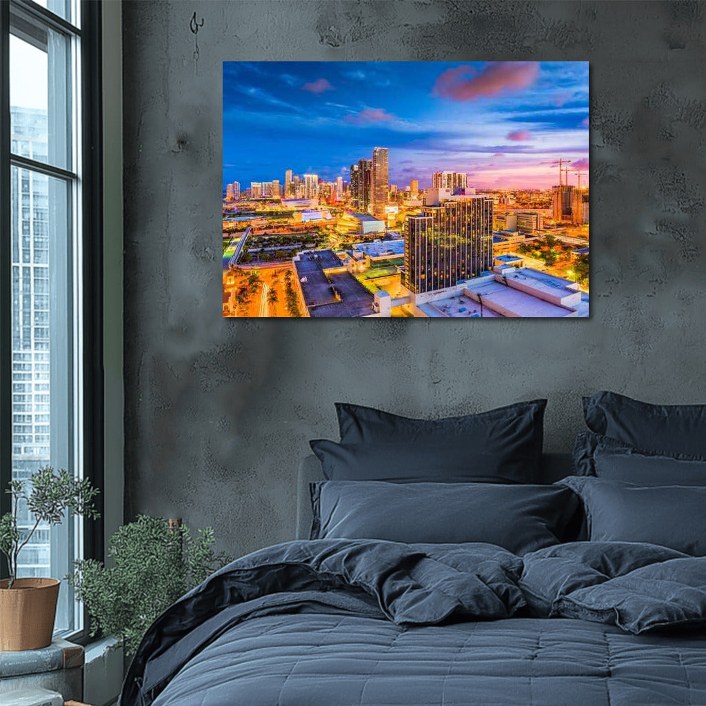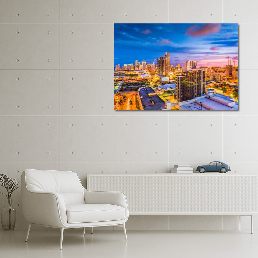 Bright dynamics of Miami evening in your interior. Painting Cityscapes Skylines, Miami USA - light, life and style on the wall. See more from the collection: Cityscapes & Skylines Art