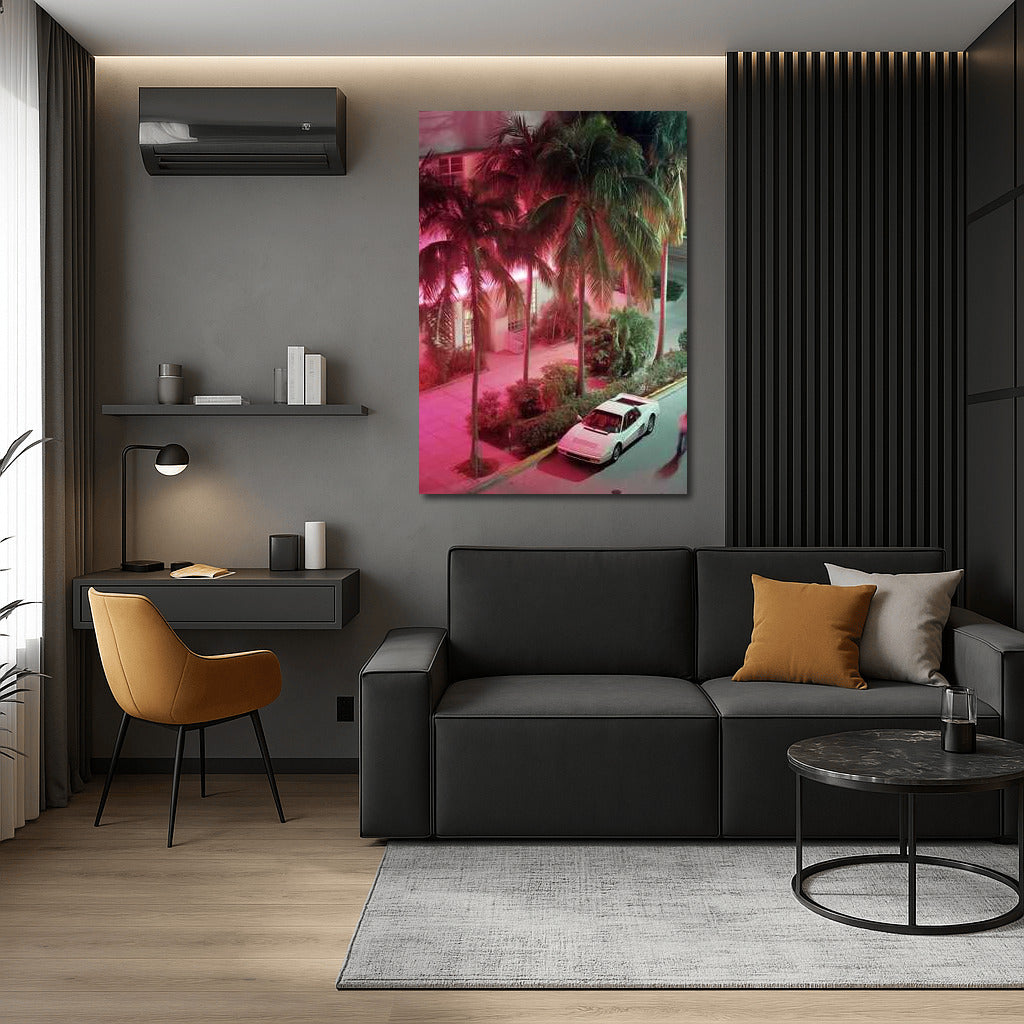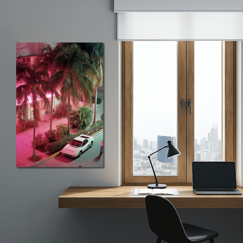 Retro glamour of Miami: neon and palm trees. Wall art that brings urban dreams to life. Cityscapes Skylines, Miami. See more from the collection: Cityscapes & Skylines Art