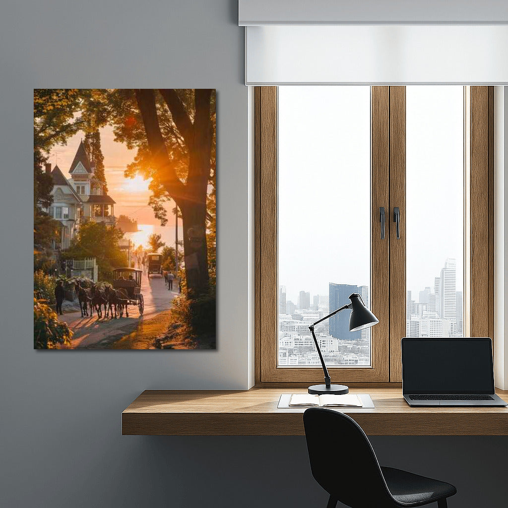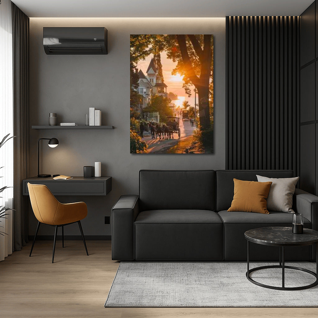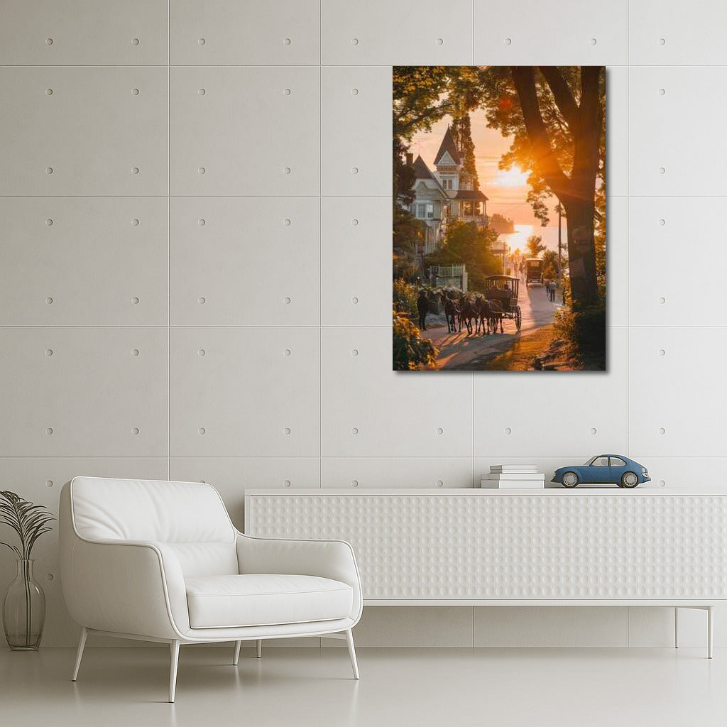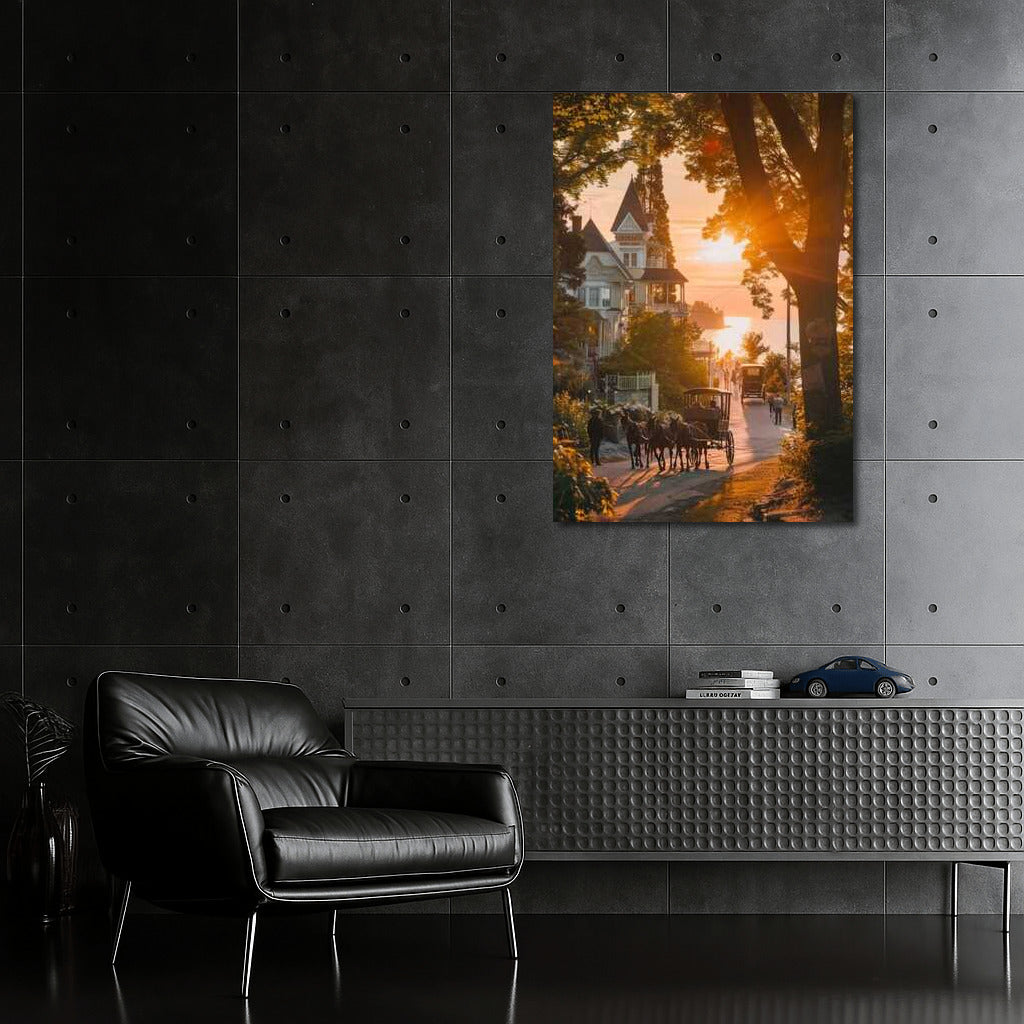 Michigan Sunset Charm - The painting reveals the rural soul of the USA. The elegant carriage enlivens the atmosphere. Your perfect poster! See more from the collection: Country Art