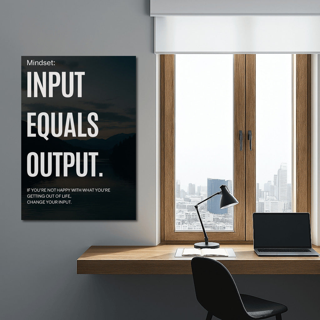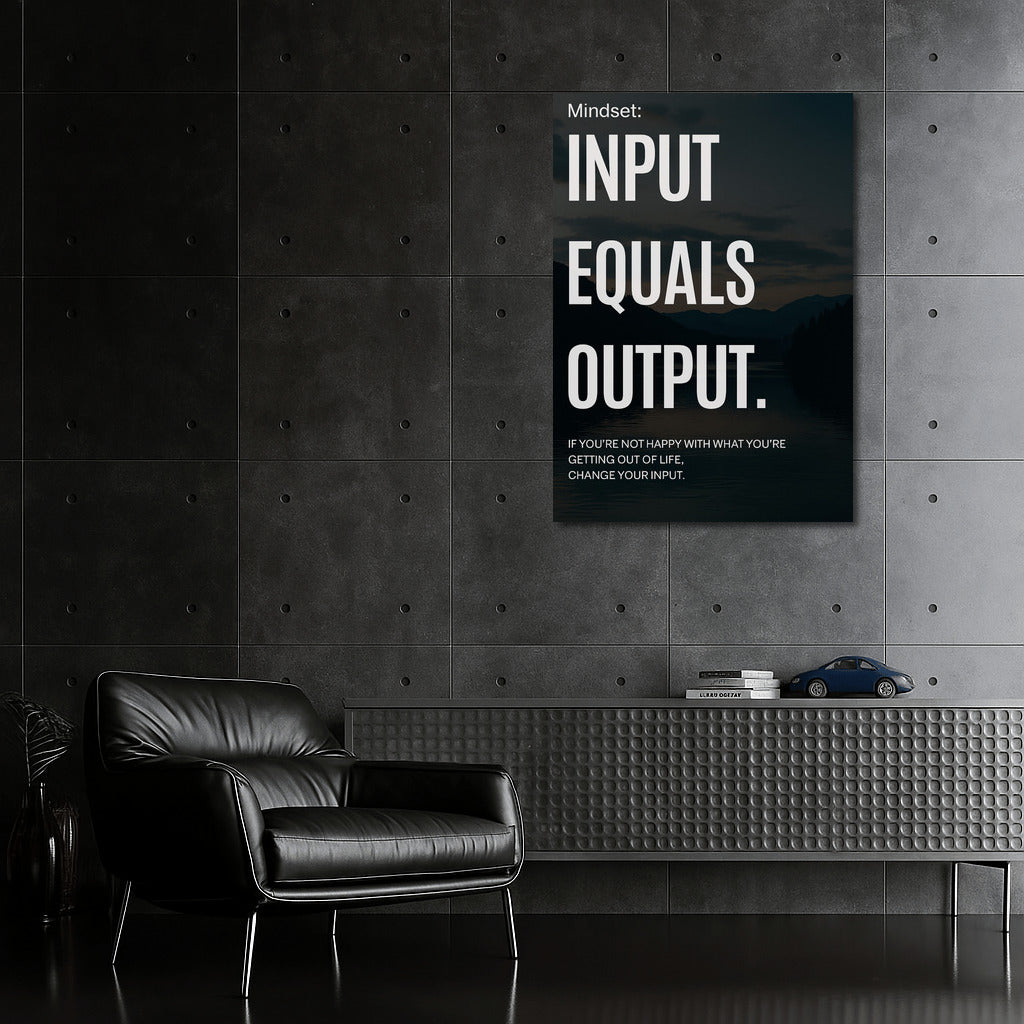 Mindset: Input Equals Output is a powerful motivator. Change your thinking and input to get the results you want. Wall art that inspires change and effort. See more from the collection: Inspirational & Motivational Quotes Art