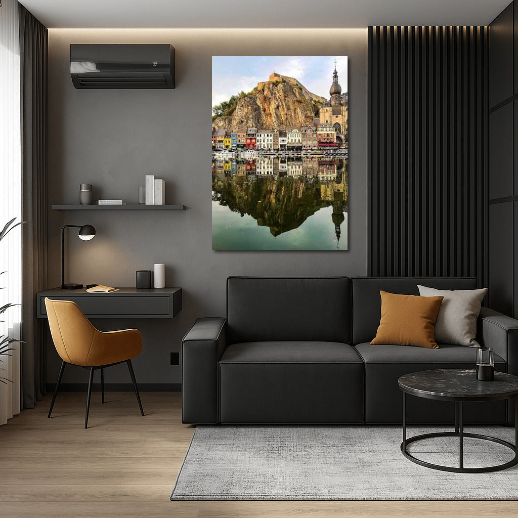 The charm of an ancient Belgian town is reflected in the river, creating the perfect poster for your interior. See more from the collection: Belgium Art