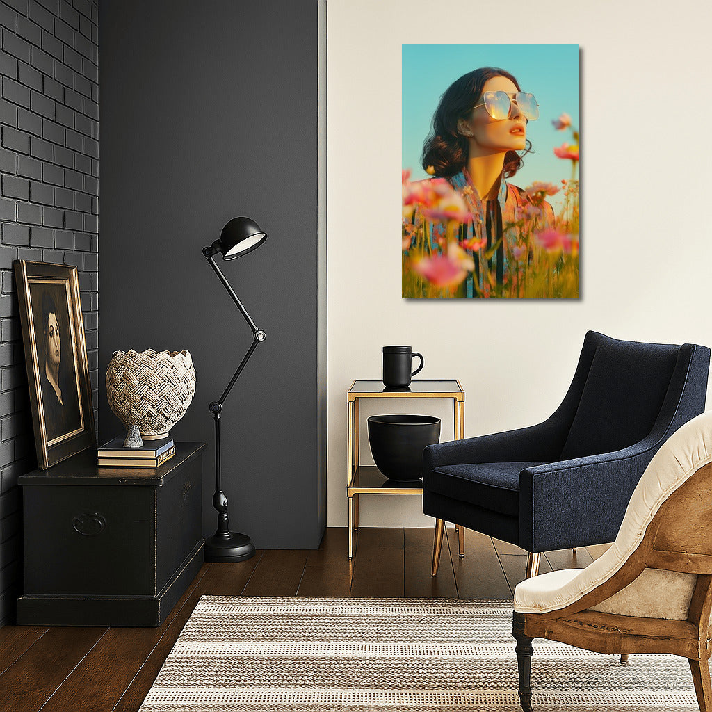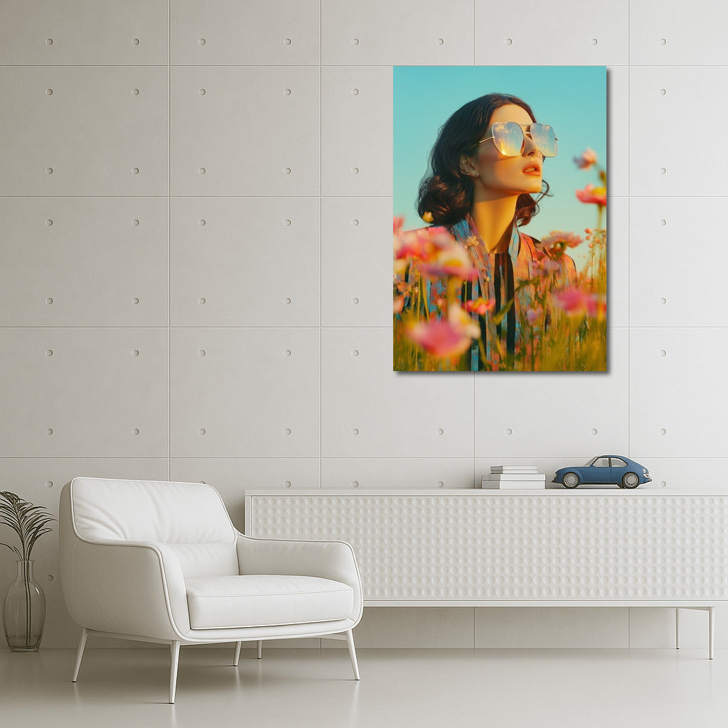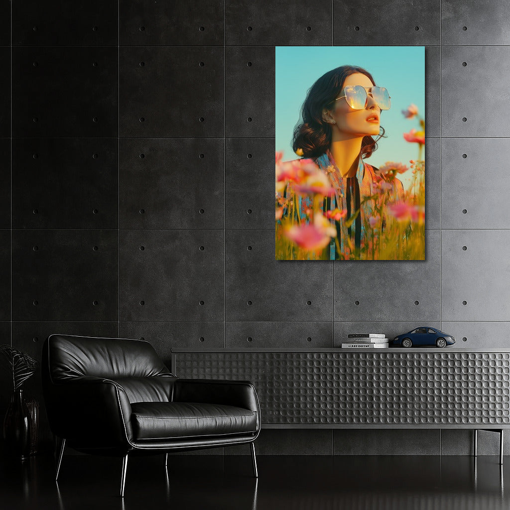 Spring poster: a mysterious figure in the reflection of sunglasses, surrounded by a blooming field. Perfect wall art for inspiration. See more from the collection: Wall Art with Women