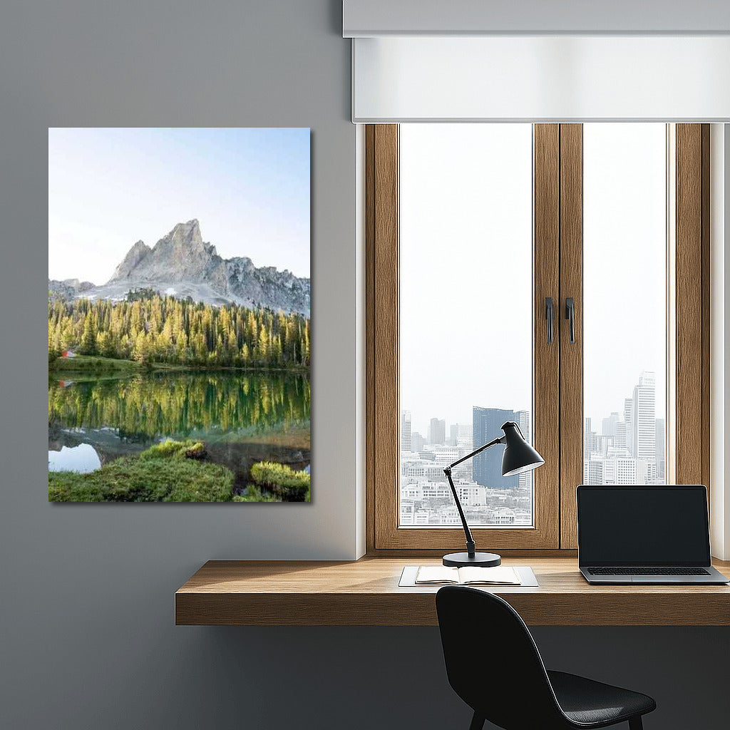 Idyllic Idaho: the poster transports you to a world of mountains and forests, where pristine nature is reflected in the mirror-like surface of the lake. See more from the collection: Country Art