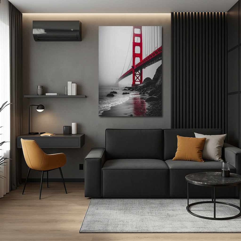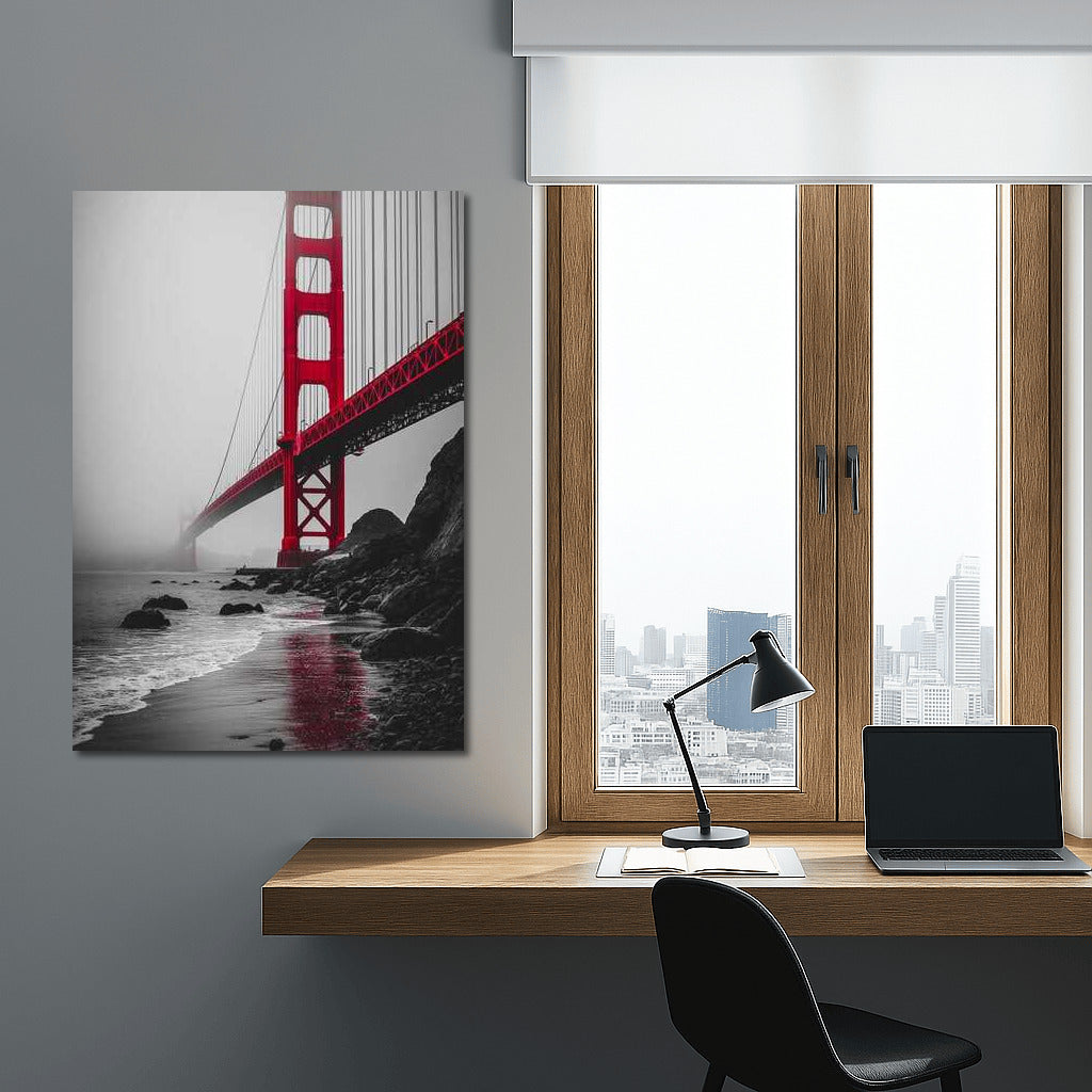 Mesmerizing poster: San Francisco red bridge in fog. Inspire the mysticism of urban landscapes on the walls of your home. See more from the collection: Cityscapes & Skylines Art