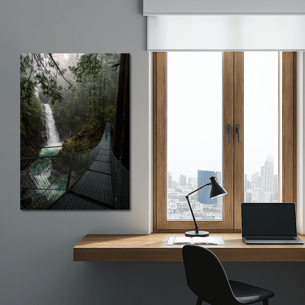 Immerse yourself in Canadian magic with this painting of mist over a dense forest and a bridge leading to a waterfall. Perfect for wall art. See more from the collection: Canada Art