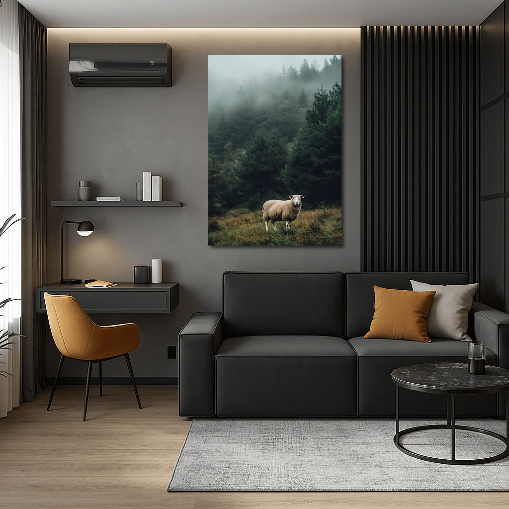 Discover the magic of nature with a poster: foggy morning, forest and sheep in the epicenter of mysterious harmony. Nature wall art! See more from the collection: Mixed Wall Art