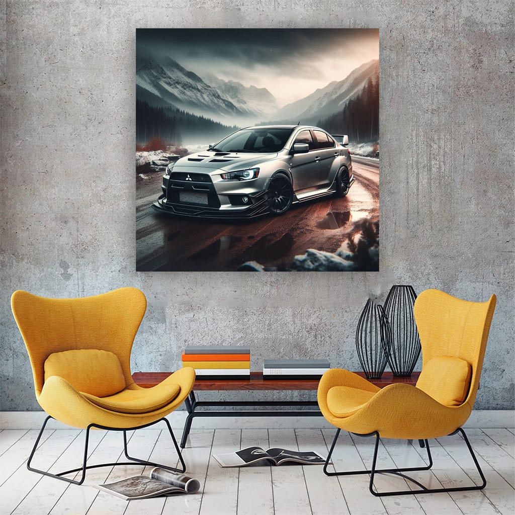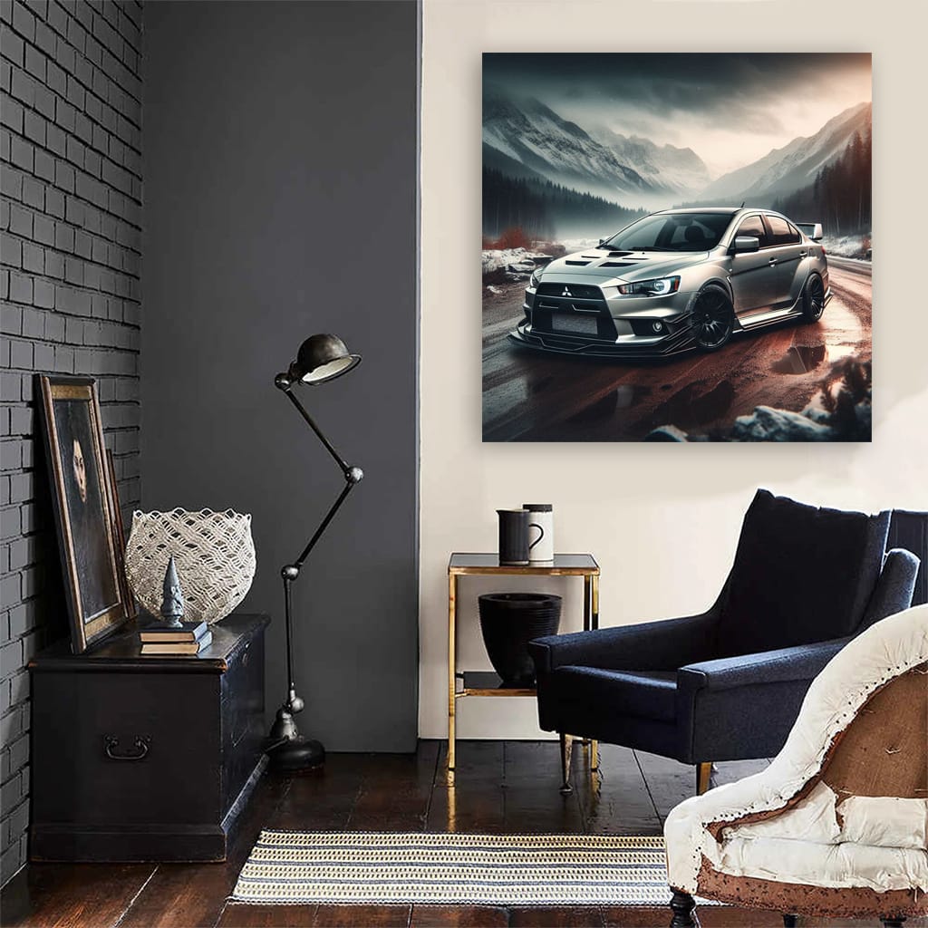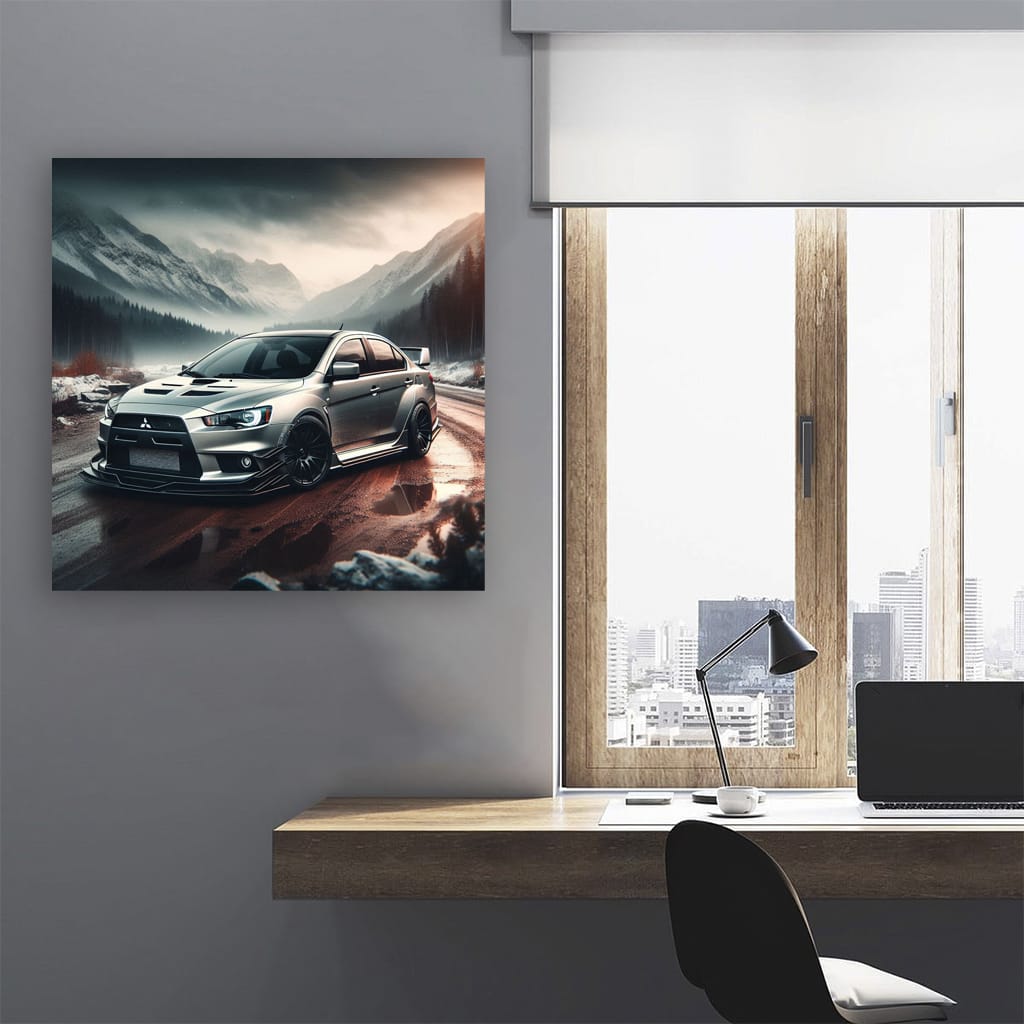 Hey bro, check out this poster of a Lancer Evo going sideways in a canyon! This isn't just wall art, it's pure adrenaline on the wall. This painting is like a turbo under the hood, it gets you going right away! Any car fan will appreciate this style. See more from the collection: Mitsubishi Art
