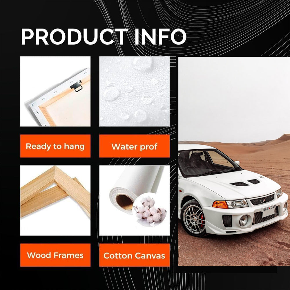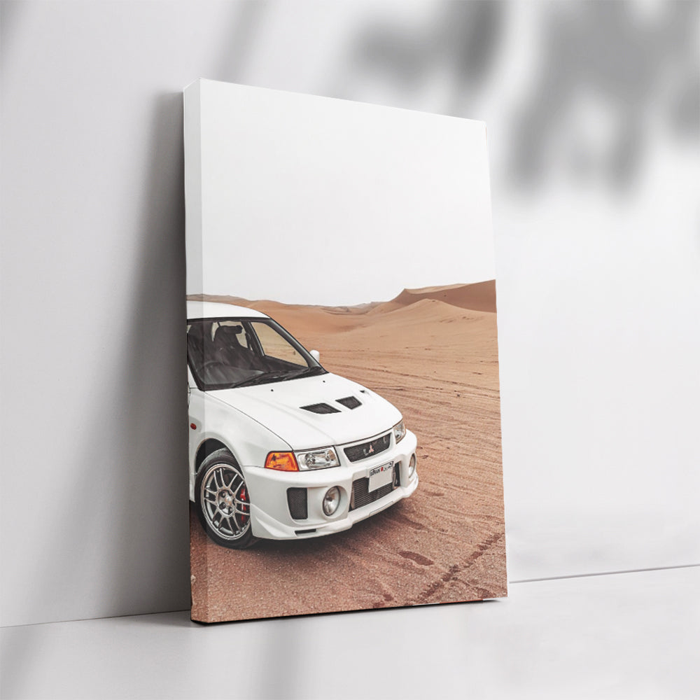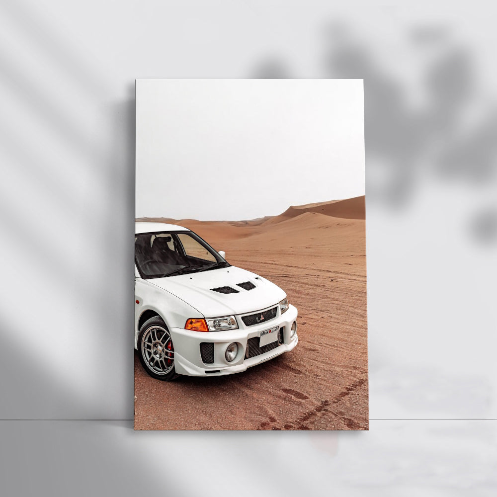 Here it is, a poster that puts any car enthusiast into a trance. A Mitsubishi Lancer, as in the painting, rushes through the desert, raising clouds of dust. This is wall art for those who live for speed. Perfect for the garage or man cave. See more from the collection: Mitsubishi Art