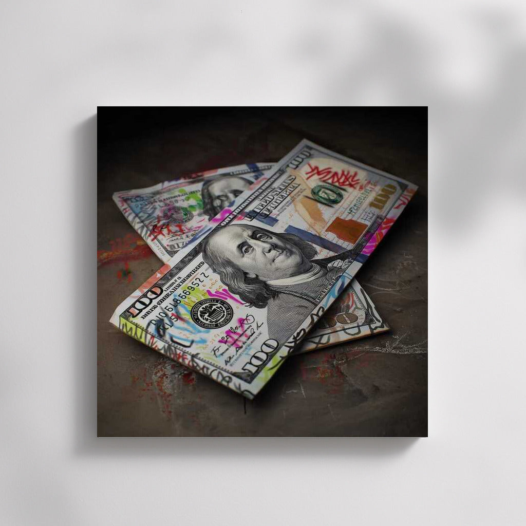 Vibrant wall art with a money theme: graffiti on banknotes, an explosion of color and style for a bold interior. See more from the collection: Money Art