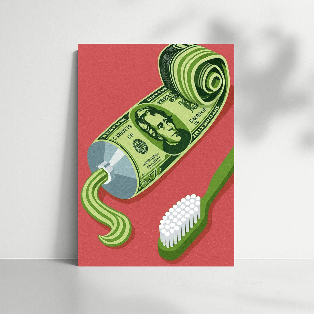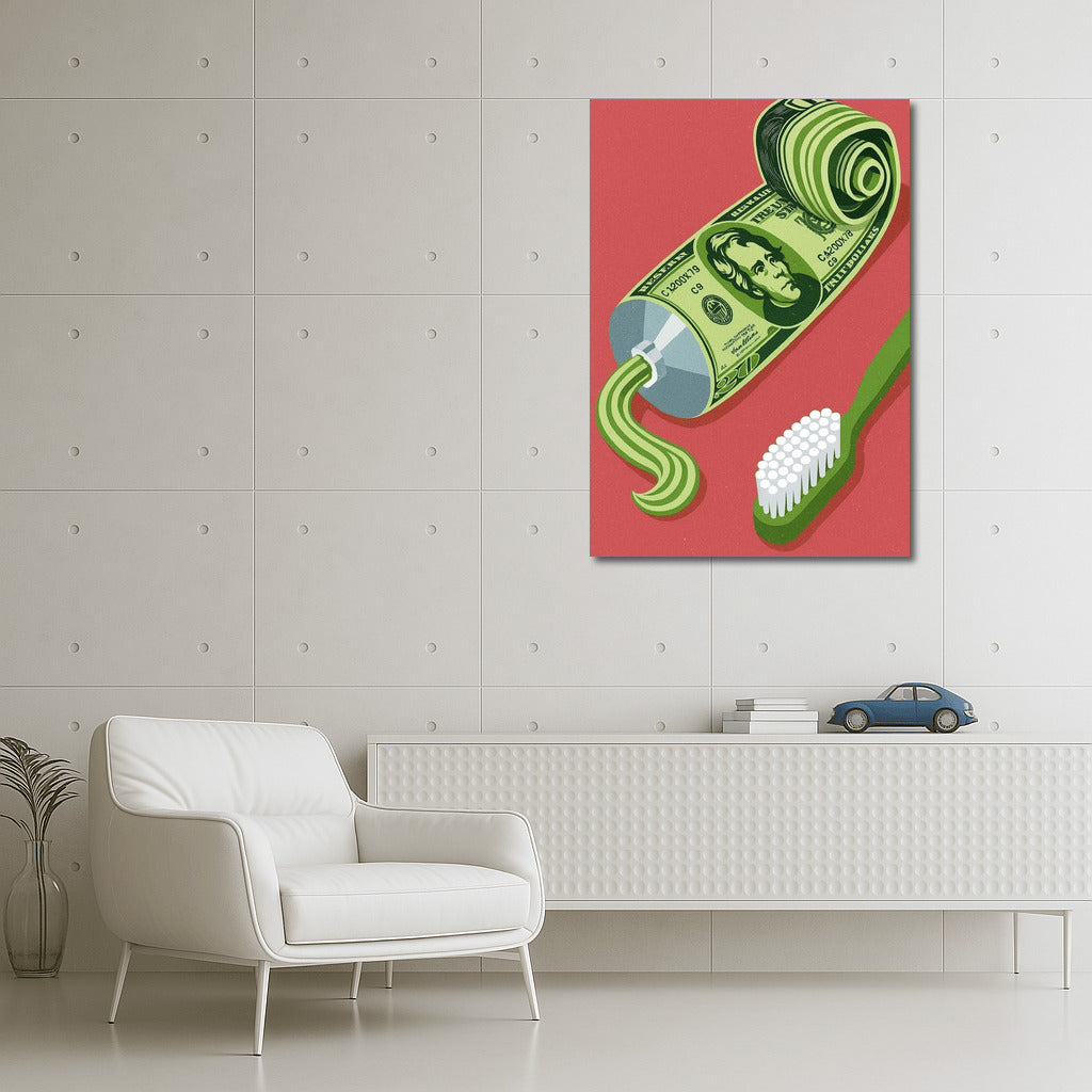 Freshen up your space with unusual wall art: money as a tube of toothpaste, a hint of wealth in the details. See more from the collection: Money Art
