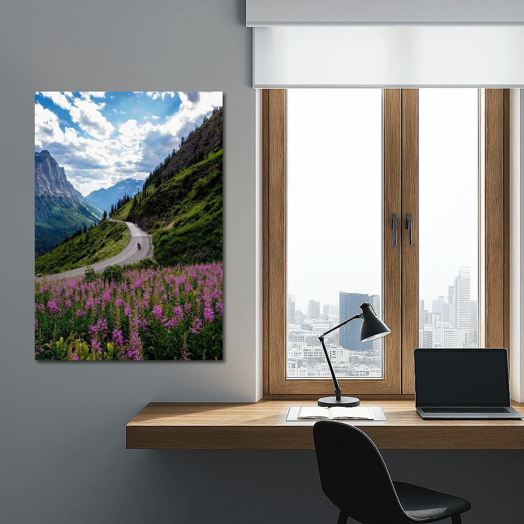 A fast-paced road through the majestic mountains and flower fields of Montana, the poster embodies the spirit of freedom and space. See more from the collection: Country Art