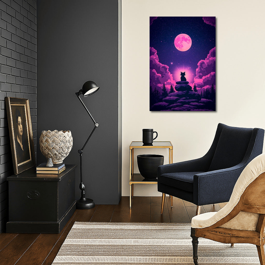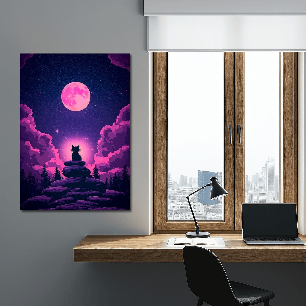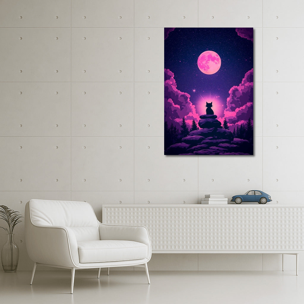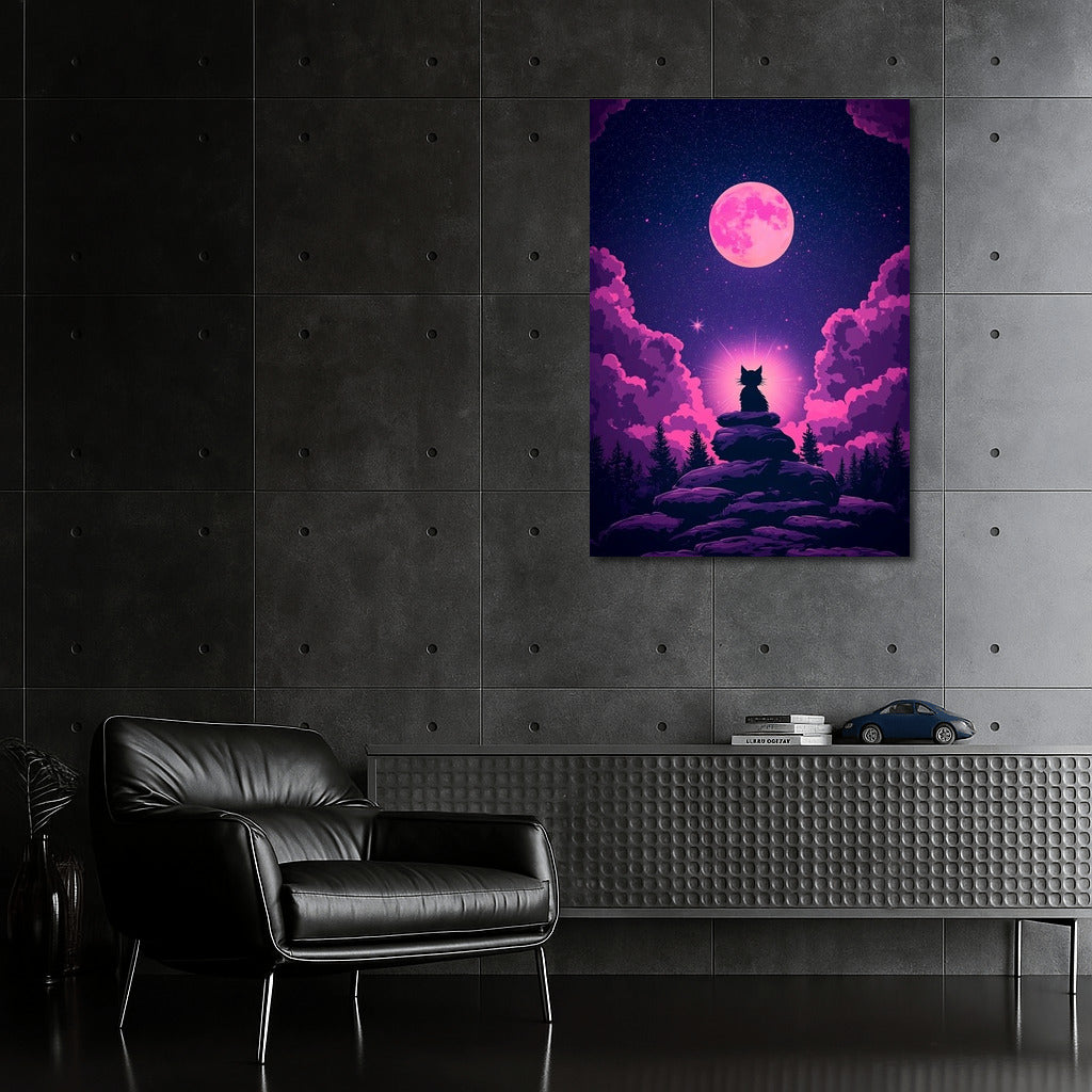 Space magic on a poster: a cat under a pink moon among stars. Wall art that inspires dreams. See more from the collection: Mysticism Art