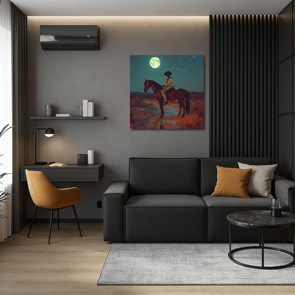 Night, stars, moon - a mysterious rider in the glitter under the moon. A poster-tandem of dreams and reality for your wall art. See more from the collection: Mixed Wall Art