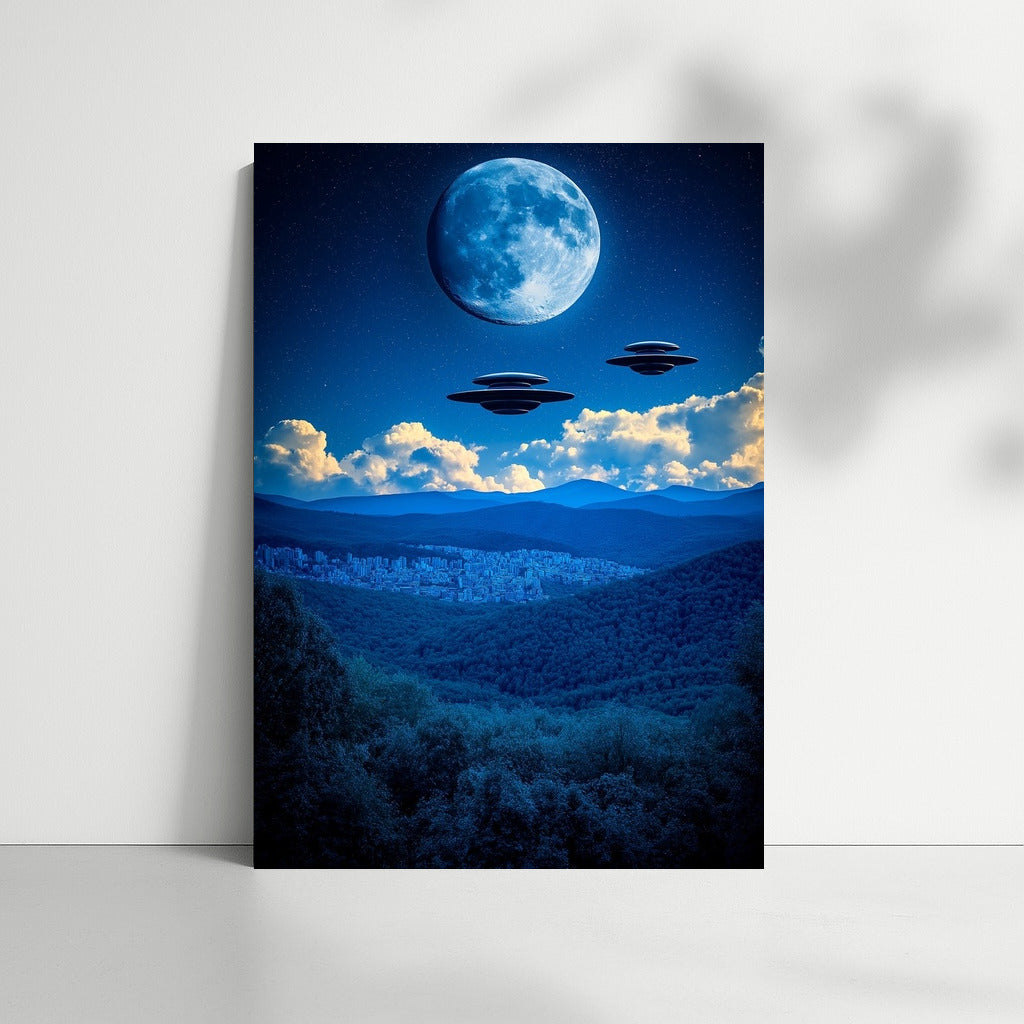Moonlit night and mysterious ships hovering over the city. This atmospheric poster is the perfect wall art for dreamers! See more from the collection: Mixed Wall Art