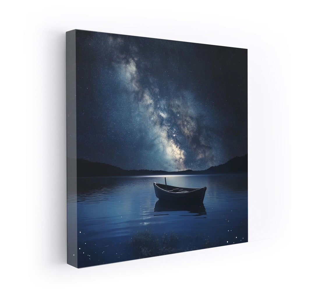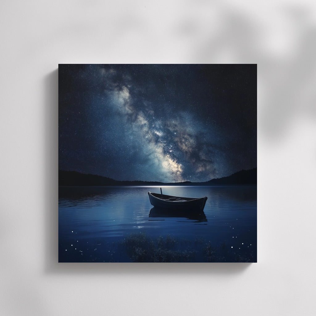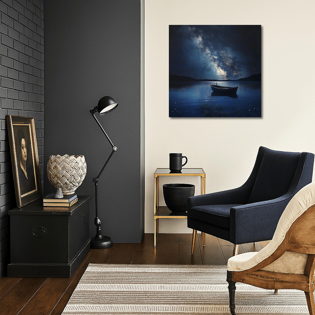 A magical painting of a boat under the starry sky. This poster will become a poetic accent of your wall art. See more from the collection: Mixed Wall Art