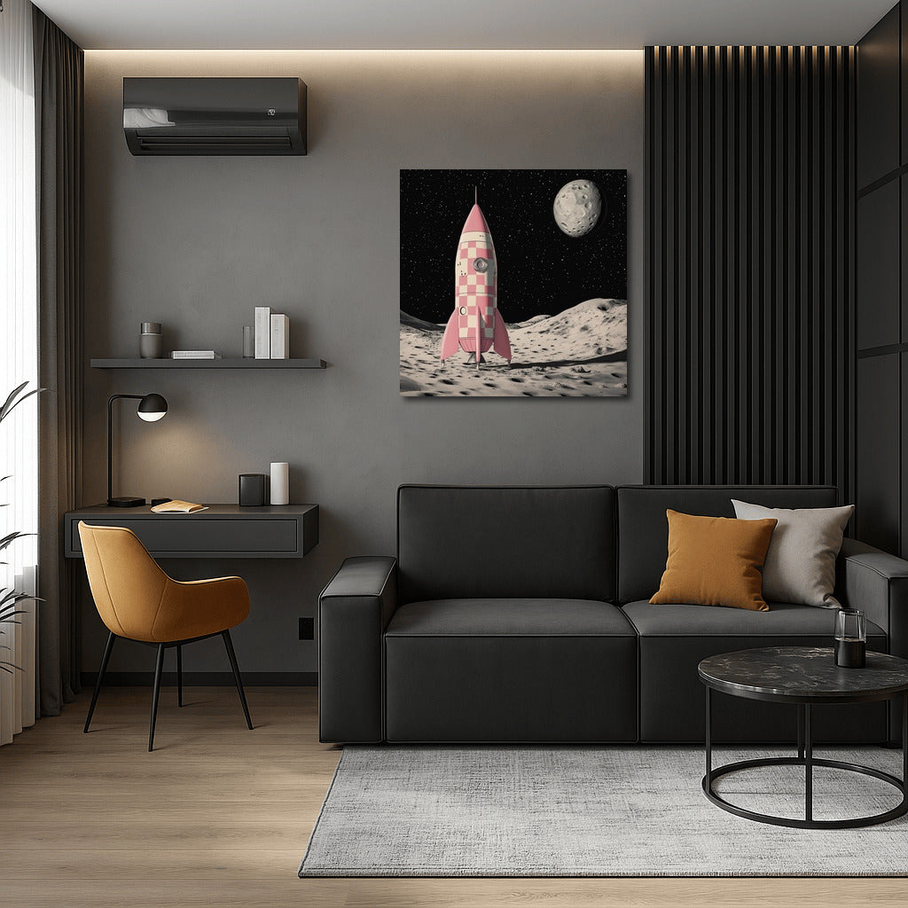 Retro space on your wall: a bright poster with a pink rocket and the moon. Inspiration among the stars and lunar landscapes! See more from the collection: Space & Astronomy Art