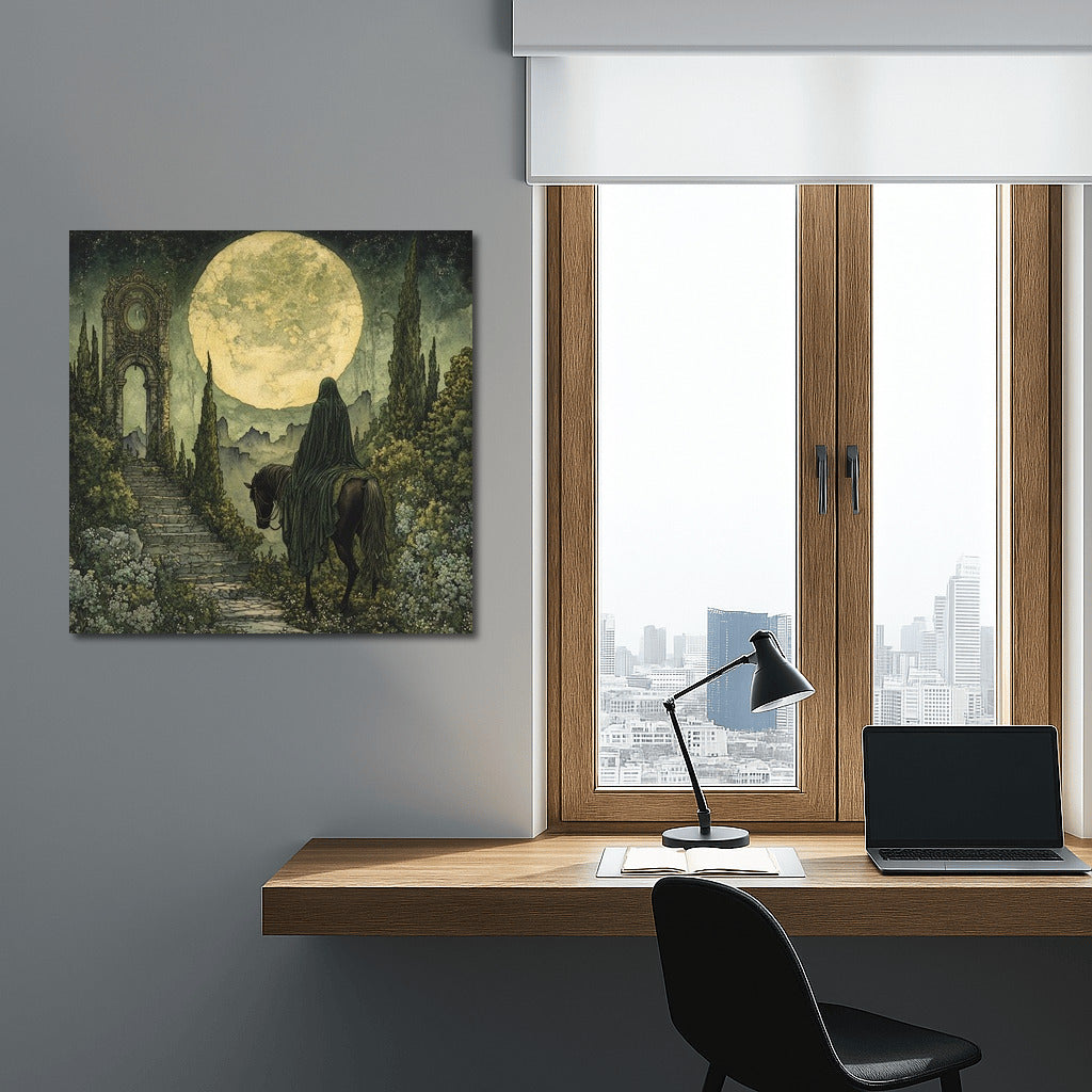 Mysterious wall art: a traveler on a horse under the moon at an ancient arch. Feel the magic and mystery in every stroke. See more from the collection: Mixed Wall Art