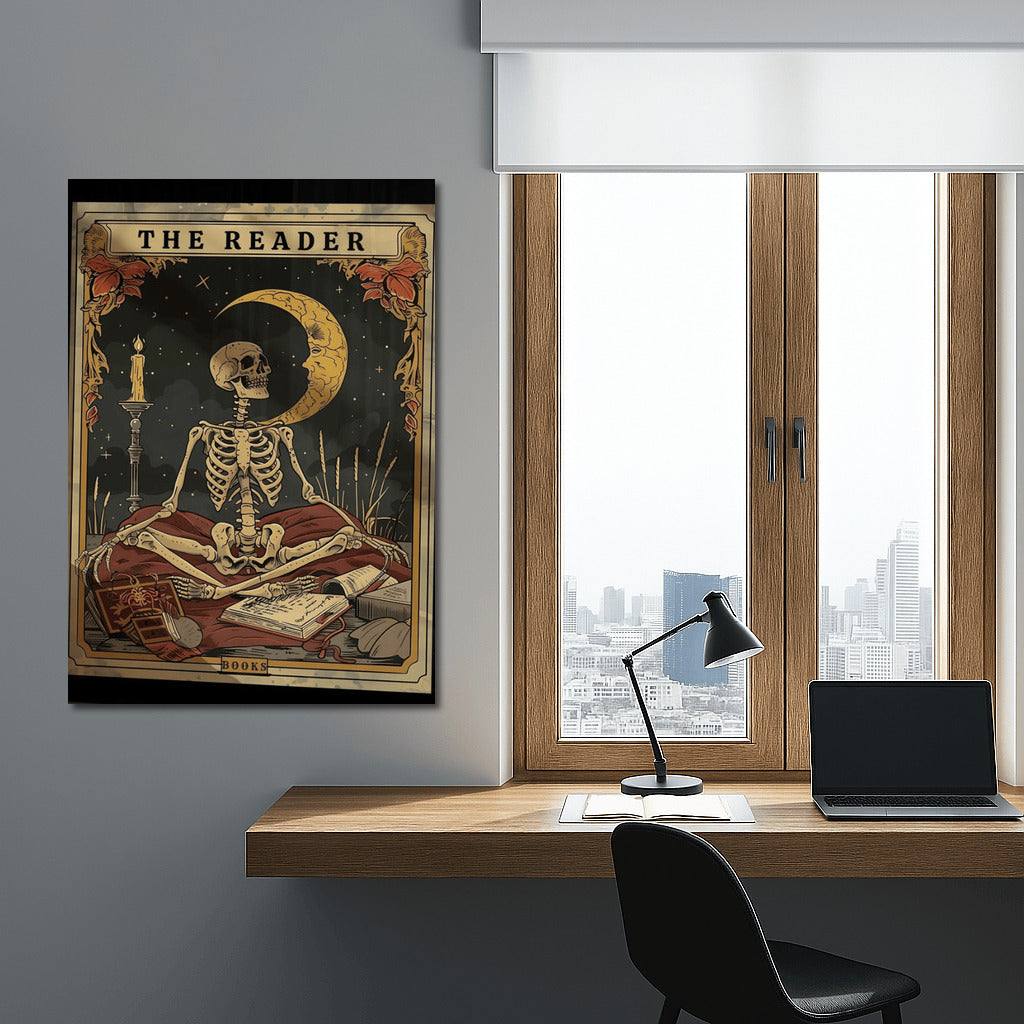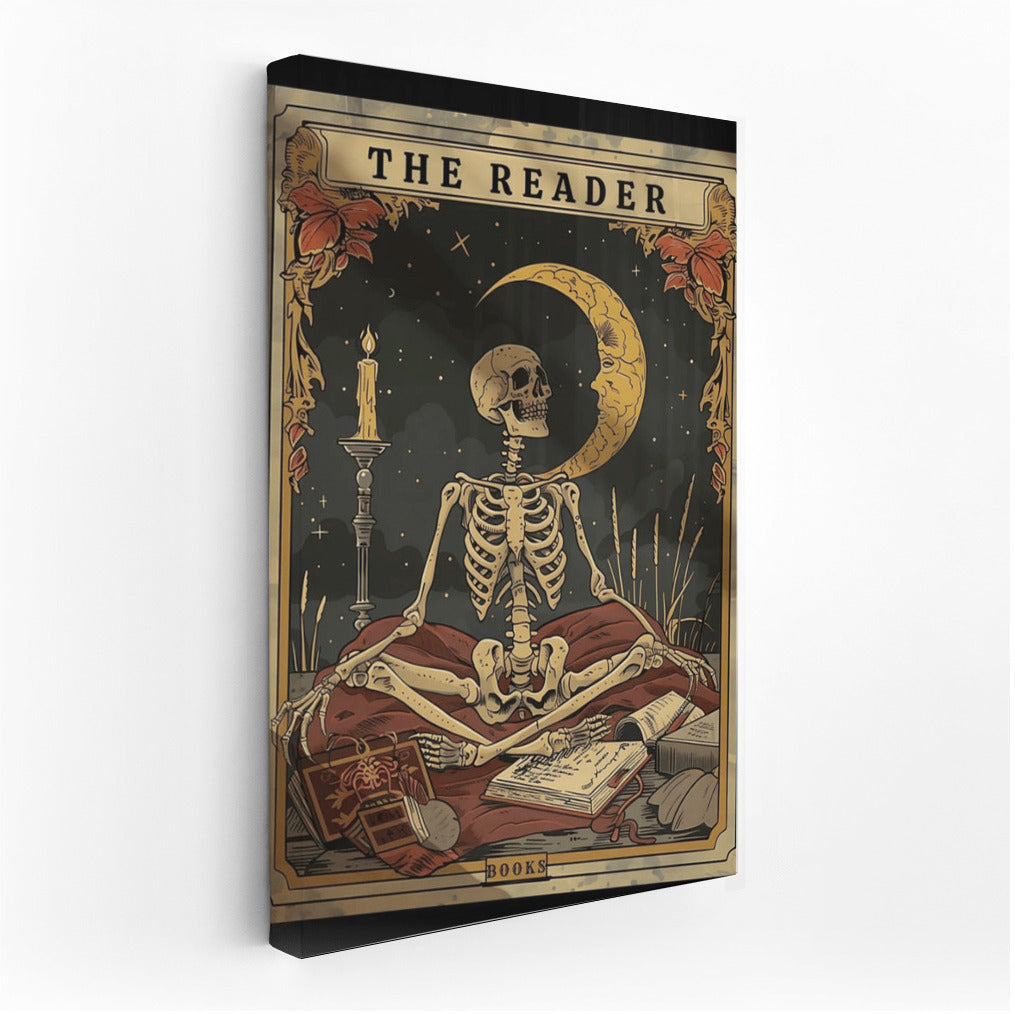 Skeleton reading under the moon, surrounded by books and candles. Gothic painting that adds mysticism to your wall art. See more from the collection: Gothic Art