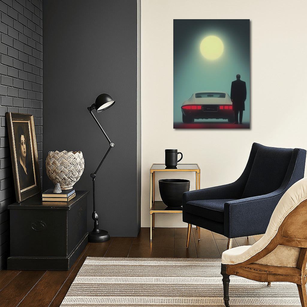 Moonlight and Jaguar E-Type: a poster where dreams and reality merge in a silent dialogue between man and car. Unique wall art. See more from the collection: Mixed Wall Art