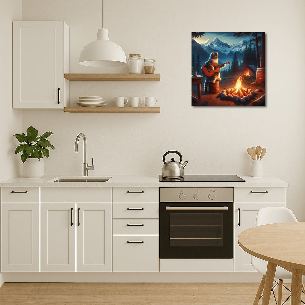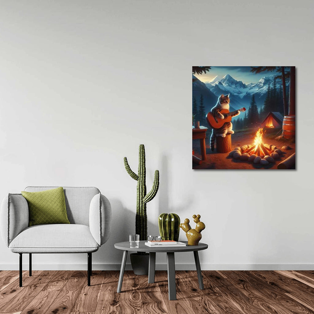 Poster Cat with guitar by the fire in the mountains - cozy wall art with a touch of magic. Perfect for dreamers! See more from the collection: Animals Art