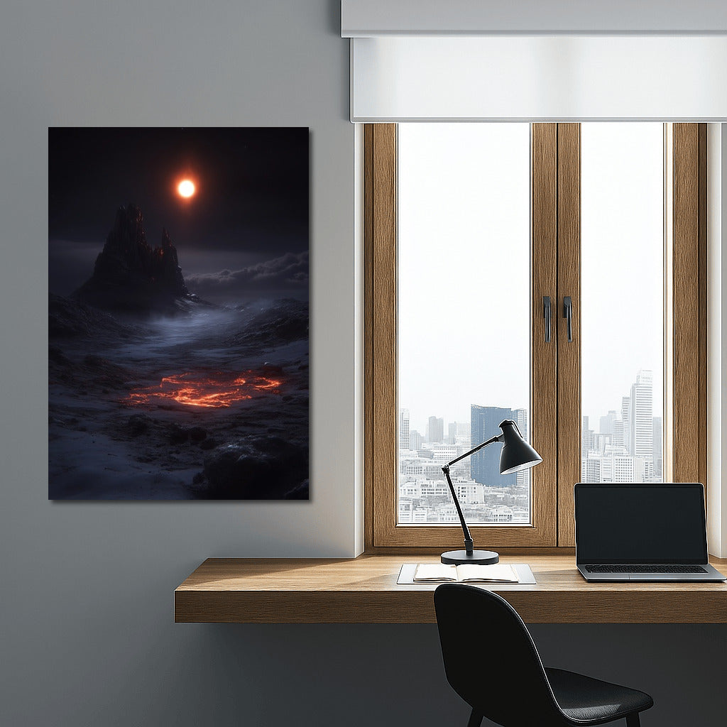 Moonlight over a mysterious mountain and hot lava is your new center of atmosphere. Perfect wall art for dreamers. See more from the collection: Mixed Wall Art