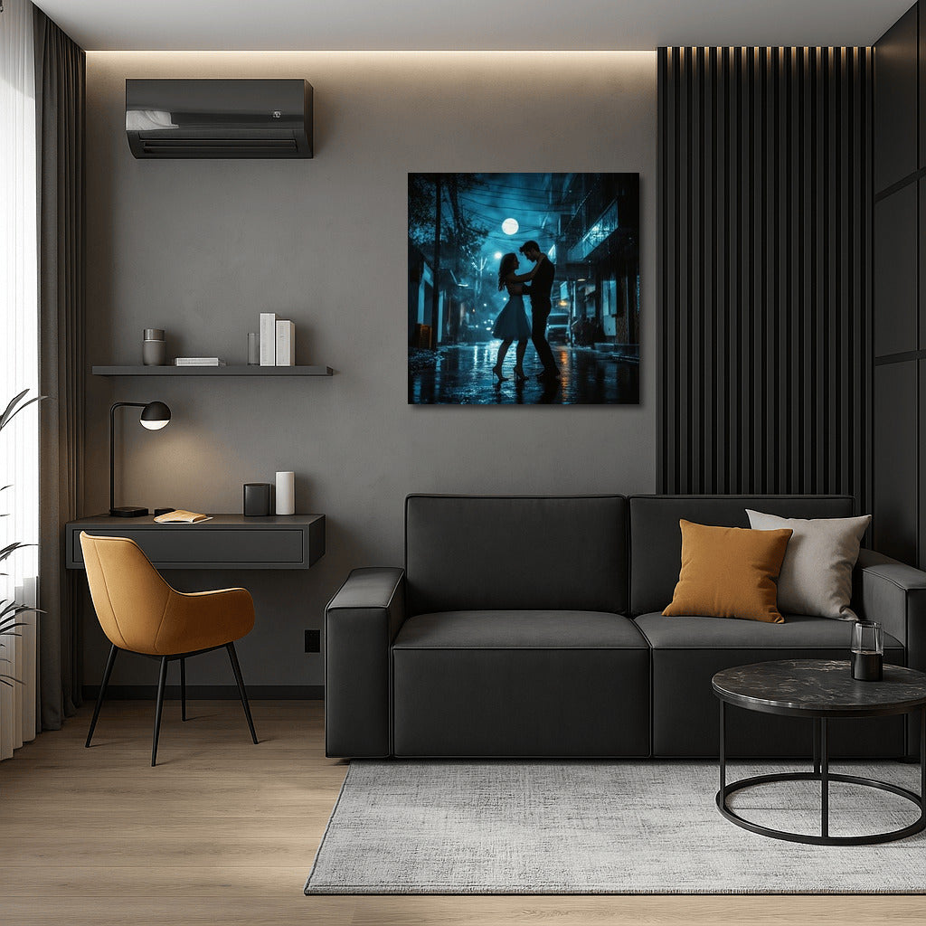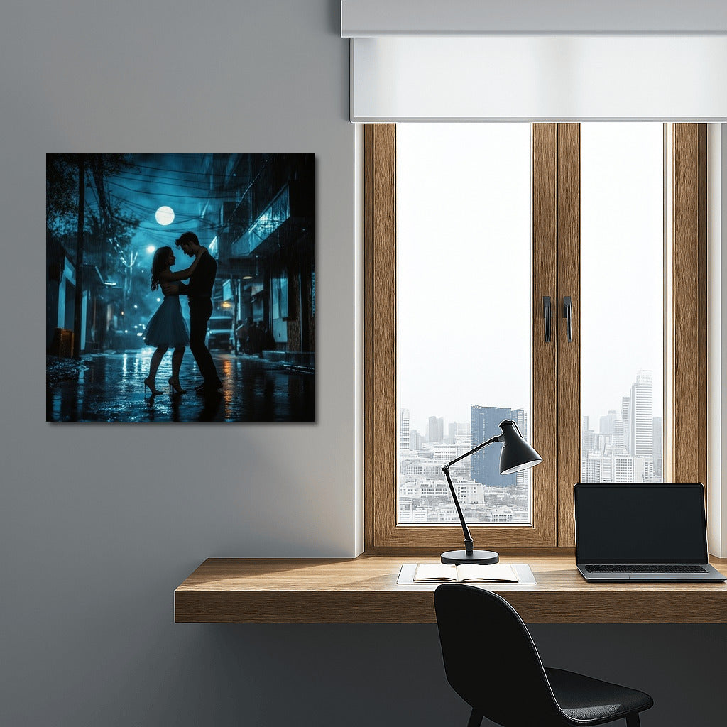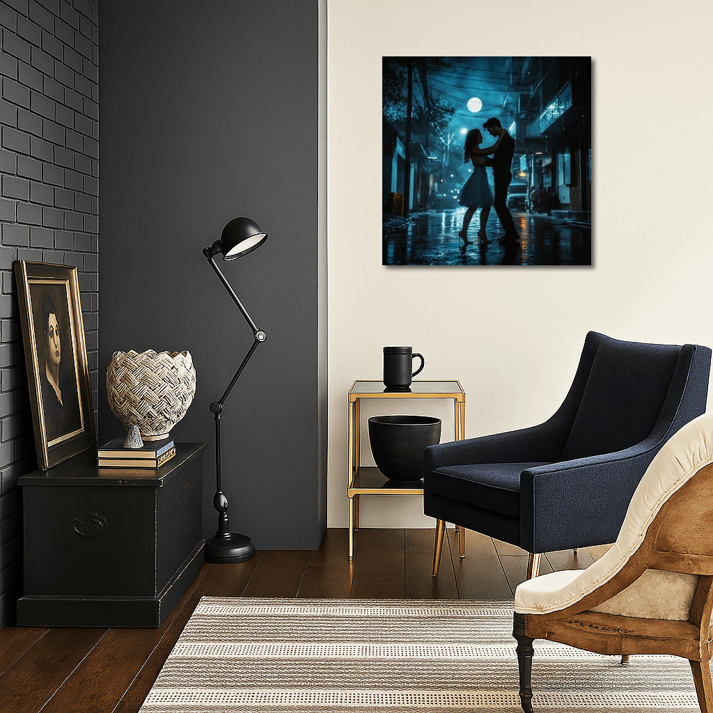 Dancing in the rain in the moonlight - the romance of the night on a poster that brings life to any space. Wall art for dreamers. See more from the collection: Love Art