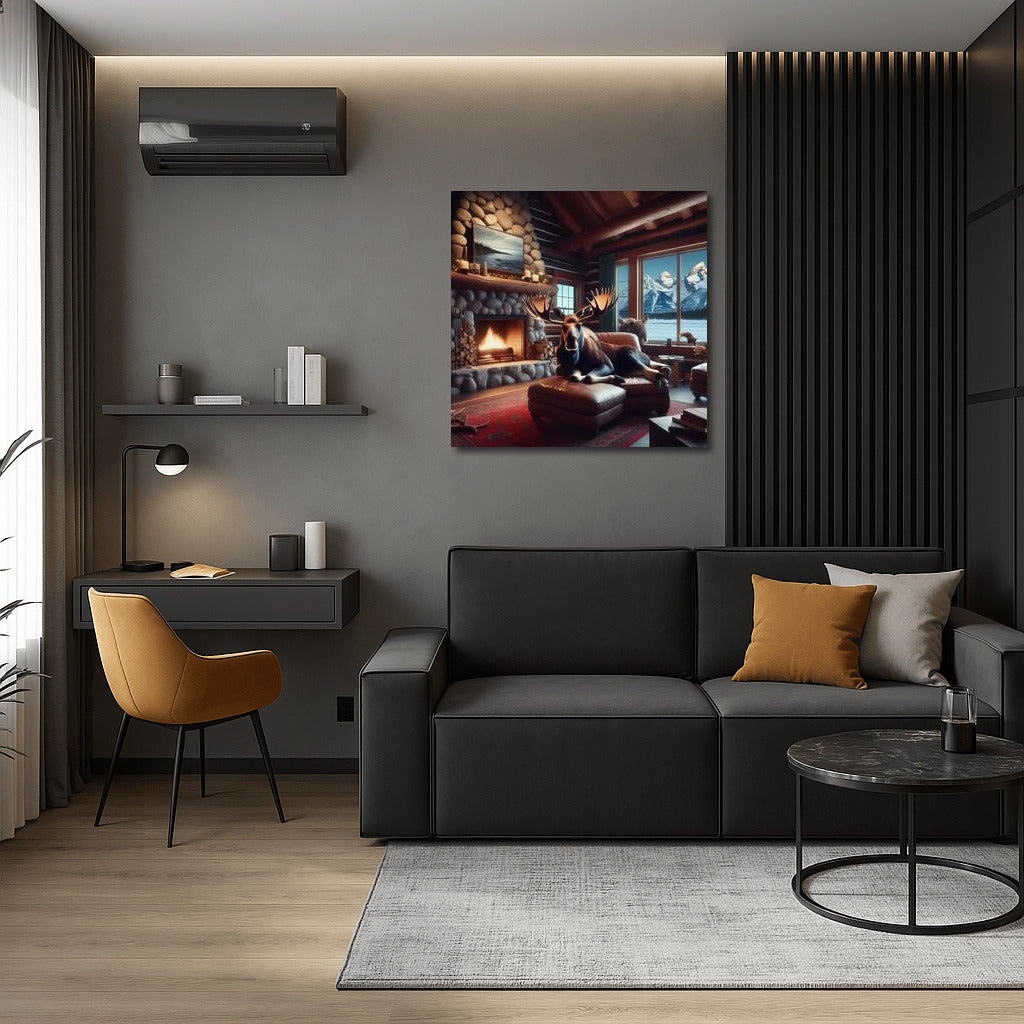 Moose by the Fireplace at the Mountain Hut: Comfort and Warmth Wall Art