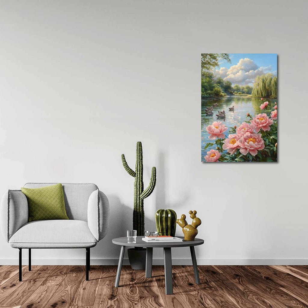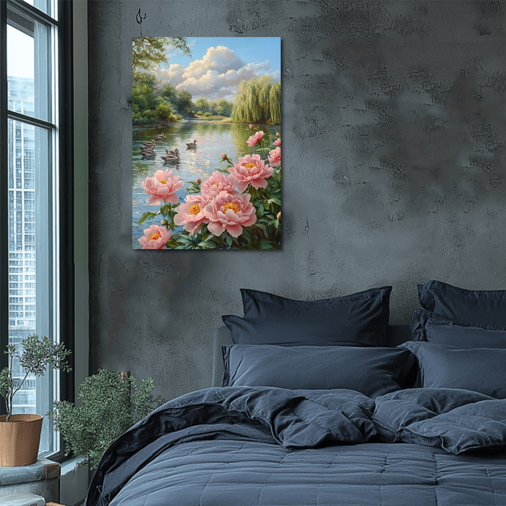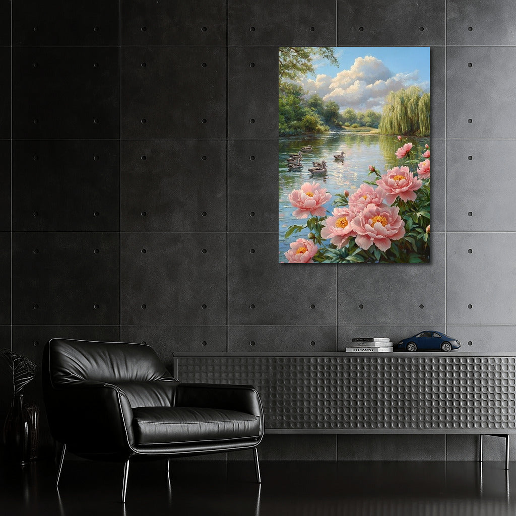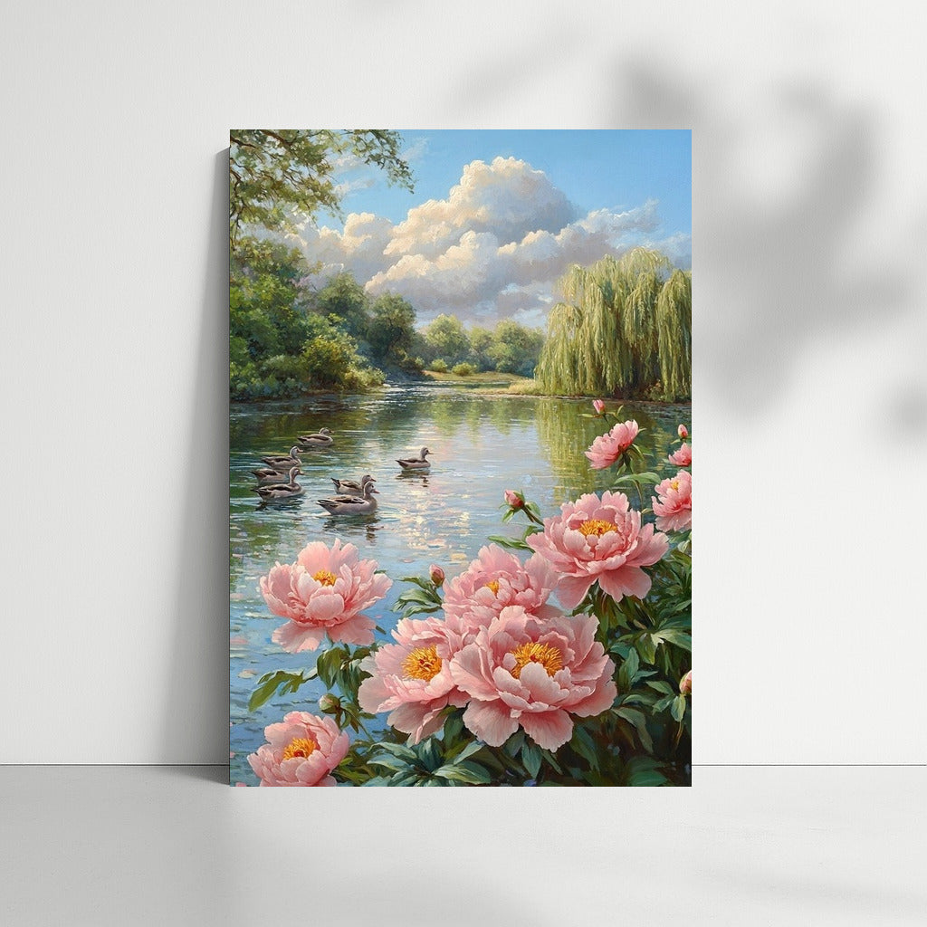 Paradise harmony of nature on the poster: ducks on the lake, delicate peonies and the grandeur of clouds will decorate your interior. See more from the collection: Nature & Landscapes Art