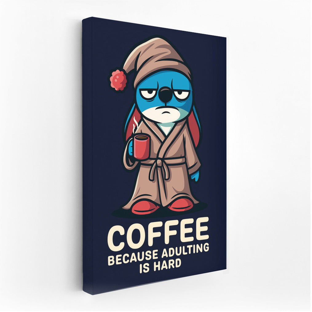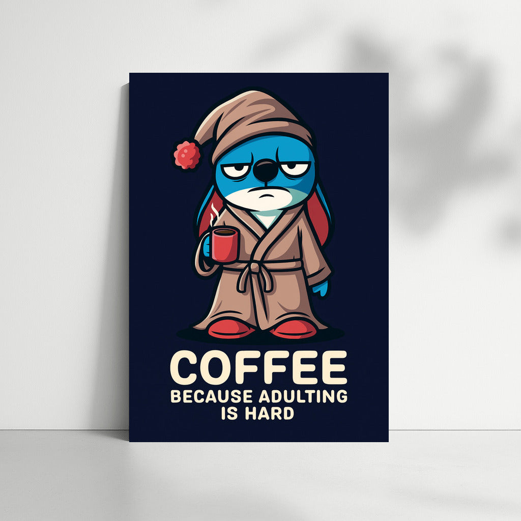 A morning dose of humor on your poster: a funny character in a robe with a cup of coffee reminds you that being an adult is no joke! See more from the collection: Humor Art