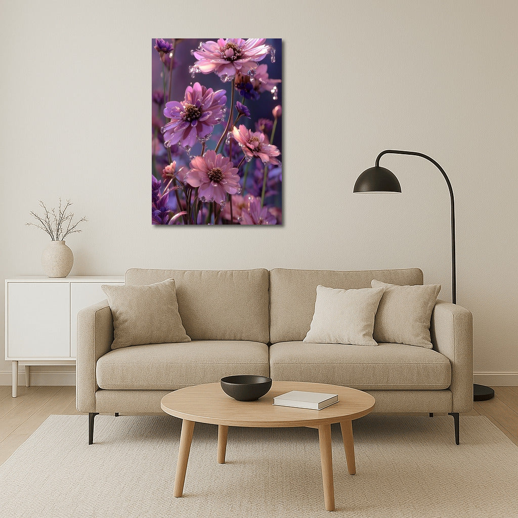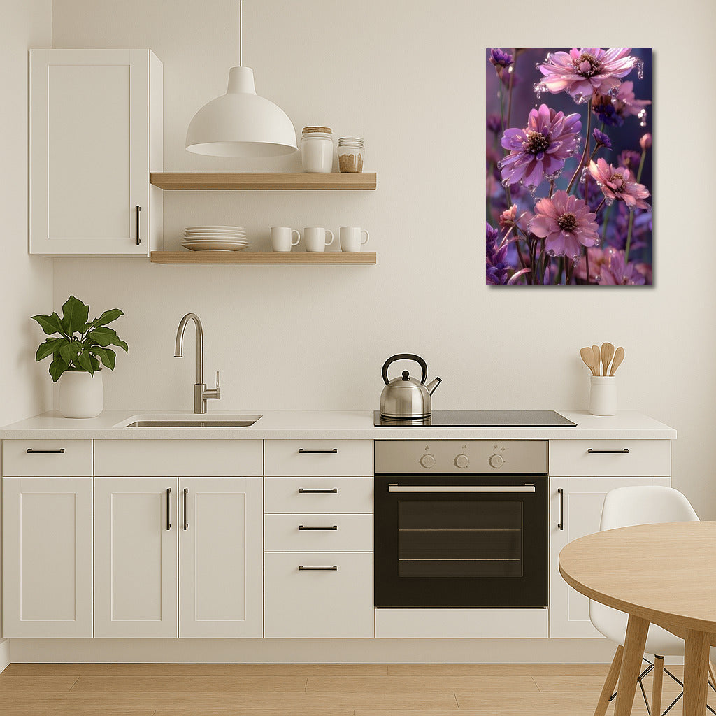 A luxurious painting with cosmos flowers shining with dew. An ideal poster to create a gentle mood in your interior. See more from the collection: Flowers Art