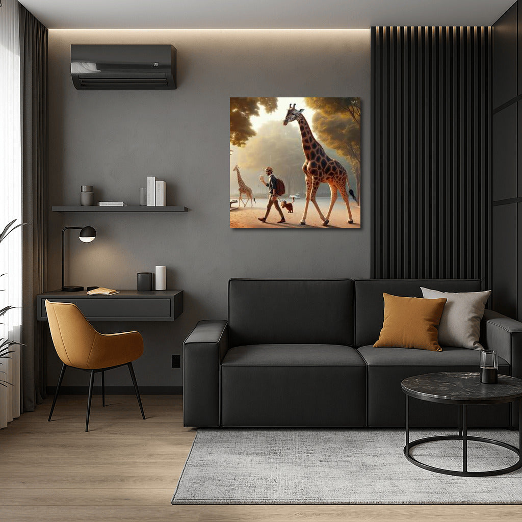 Giraffe walking with a cup of coffee - morning in the park comes to life in this painting. Wall art with a touch of fantasy and coziness. See more from the collection: Animals Art
