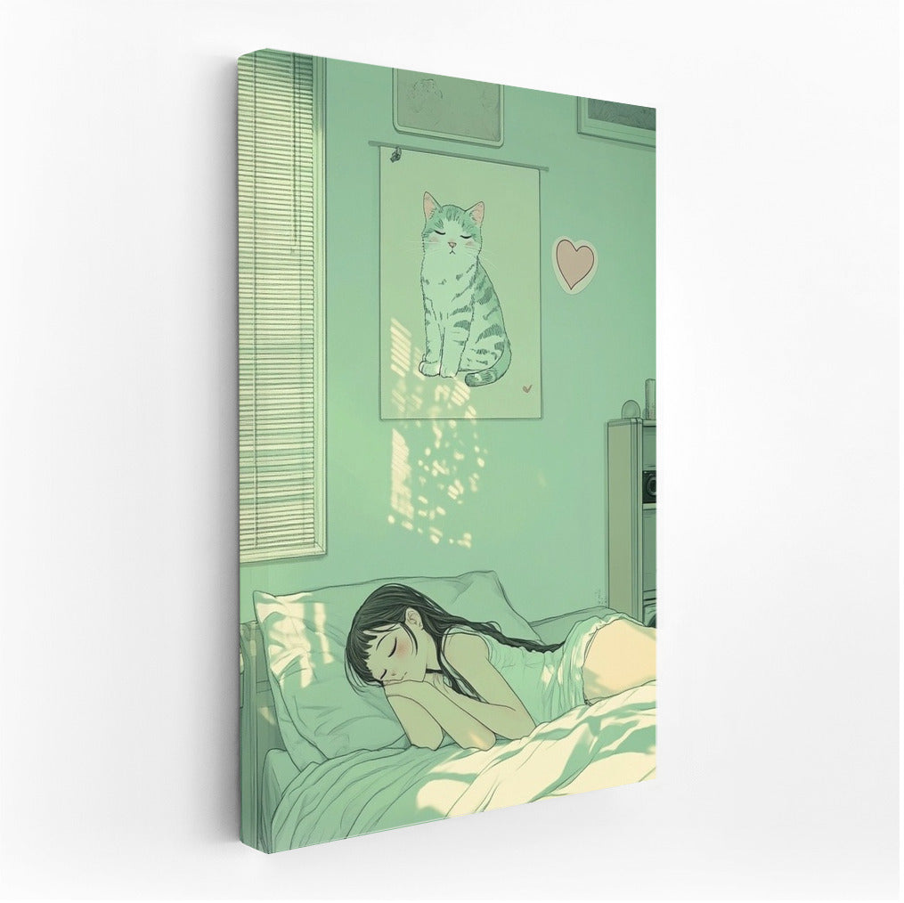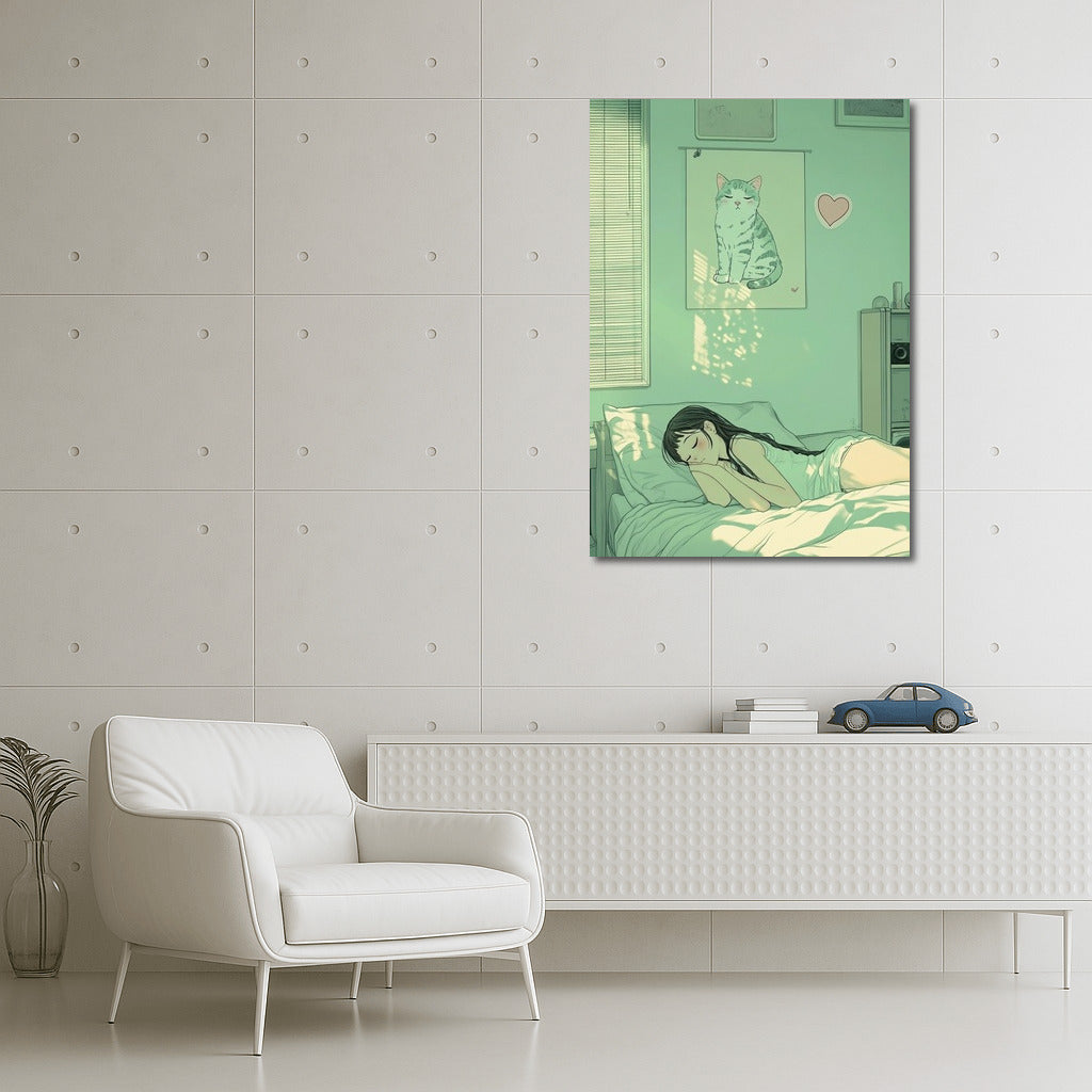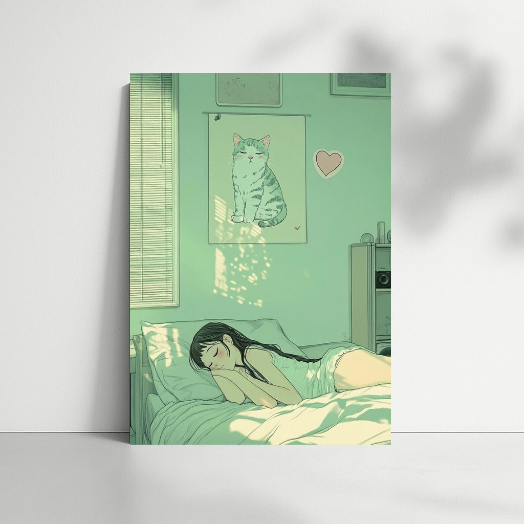 Morning lightness on canvas: girl in the silence of her room, sunlight and a poster with a cat create an atmosphere of calm. Wall art of sleep. See more from the collection: Anime & Manga genres Art