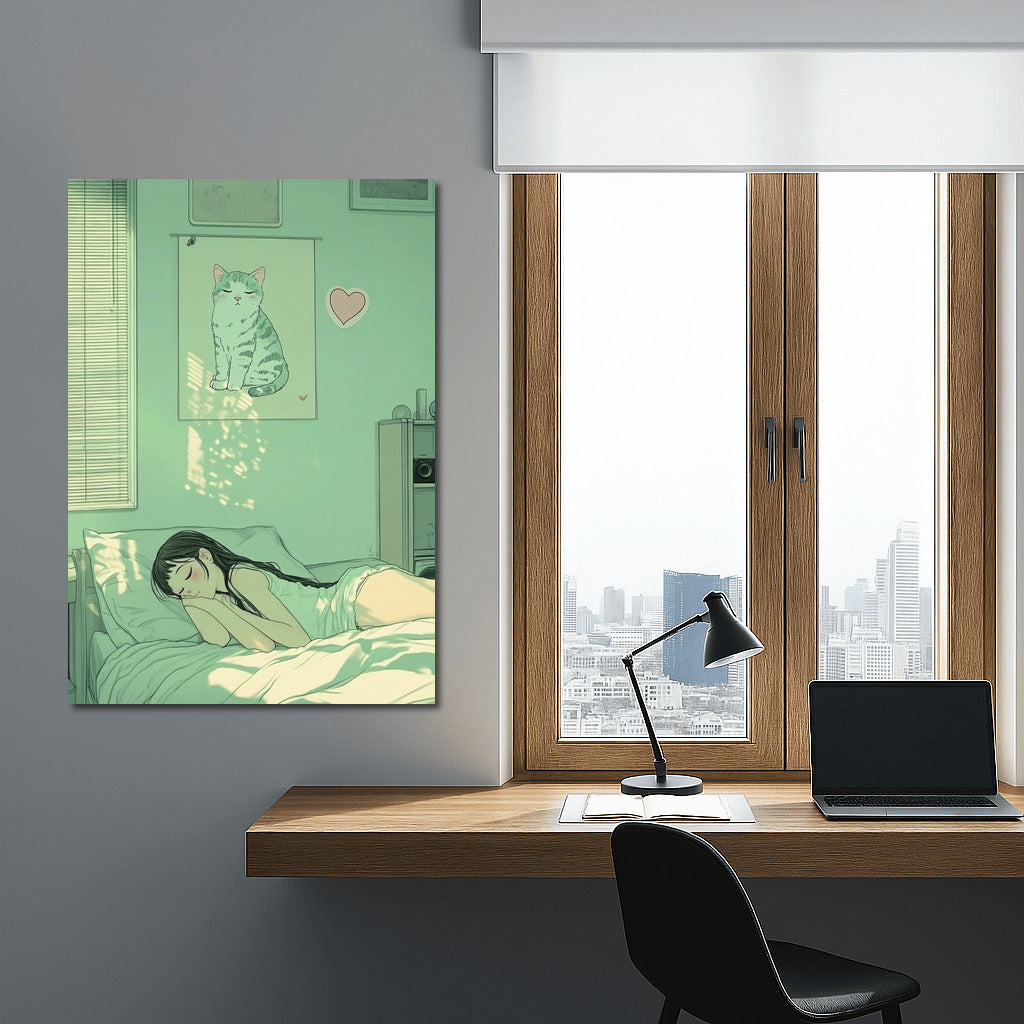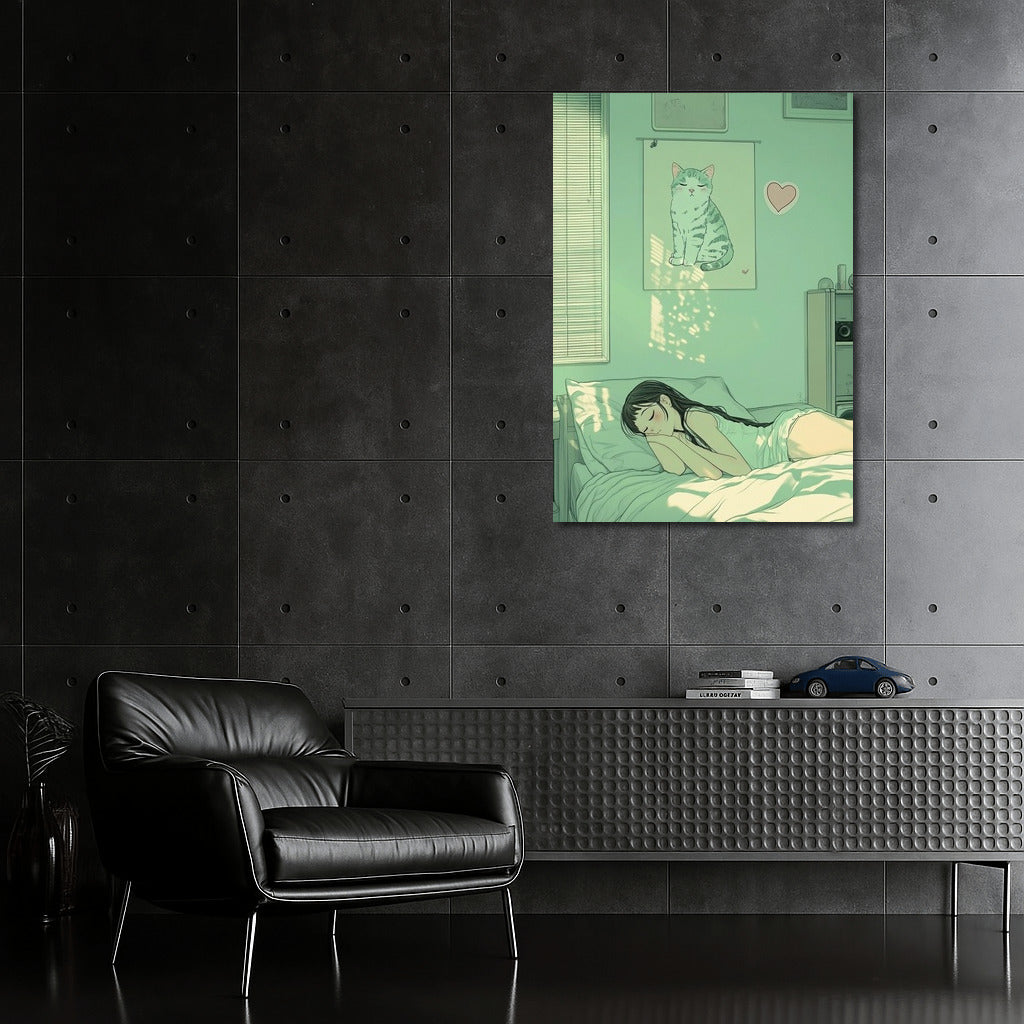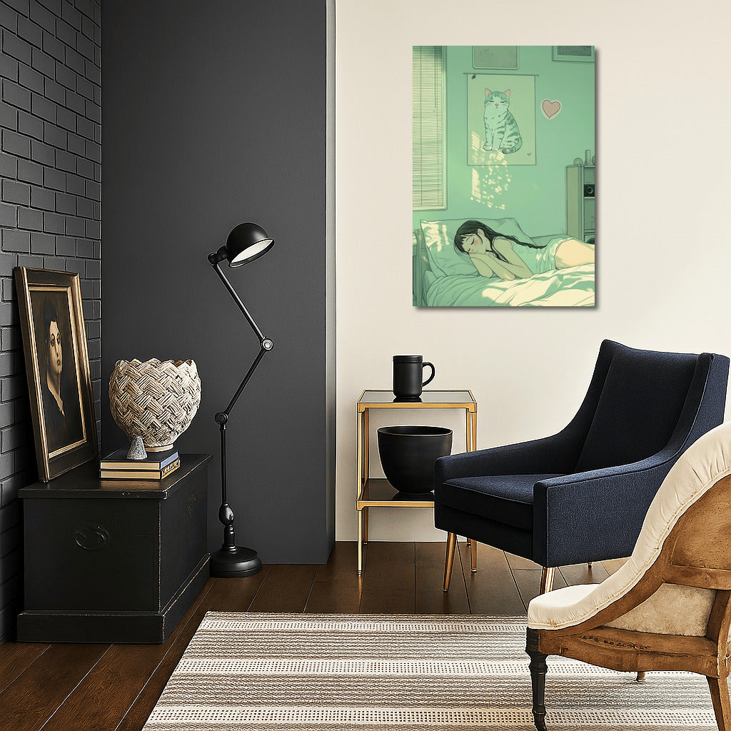 Morning lightness on canvas: girl in the silence of her room, sunlight and a poster with a cat create an atmosphere of calm. Wall art of sleep. See more from the collection: Anime & Manga genres Art