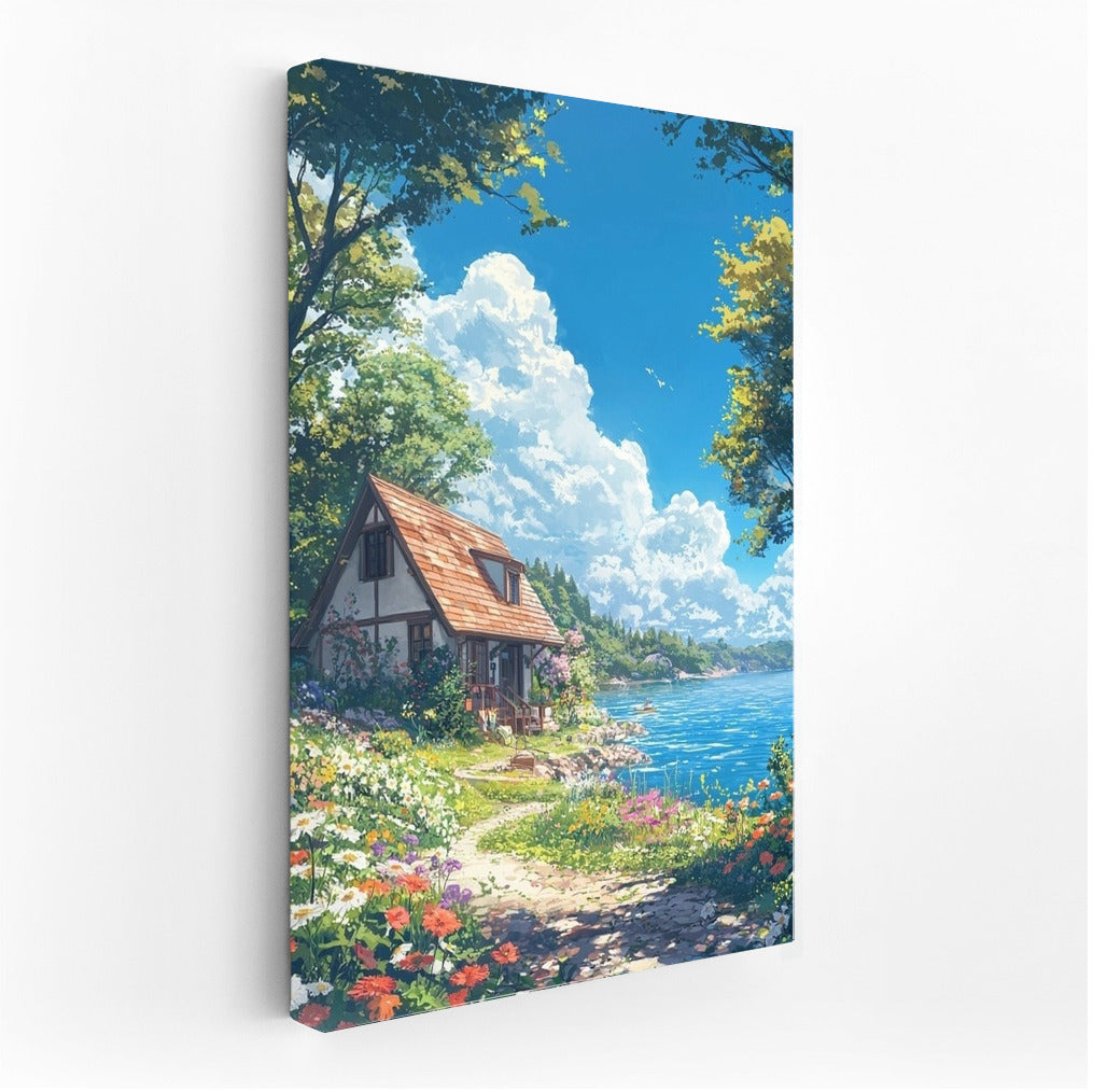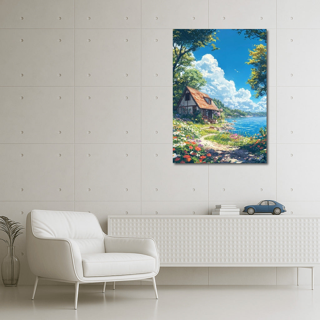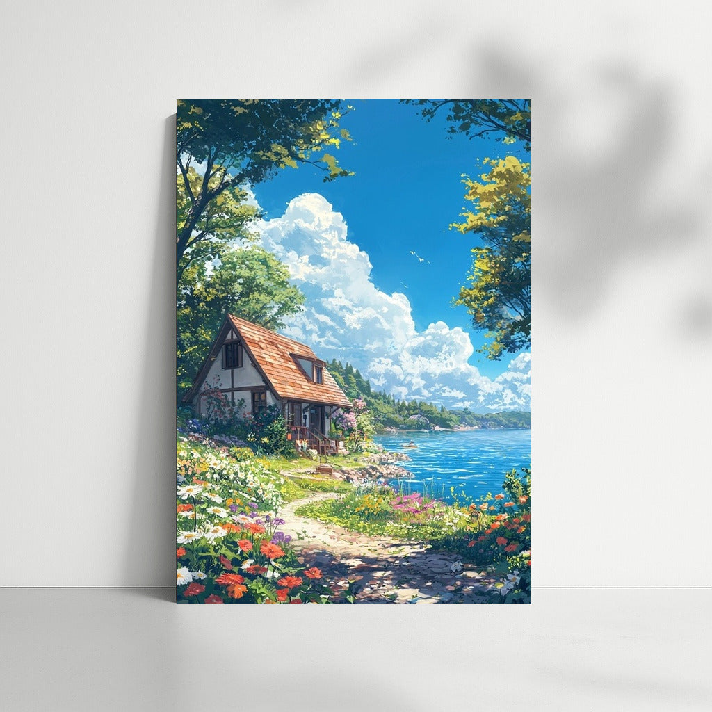 Sunny idyll: poster landscape with a house by the lake surrounded by flowers. Attractive wall art for coziness and inspiration. See more from the collection: Anime & Manga genres Art