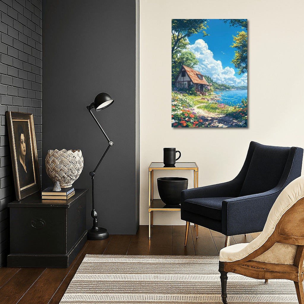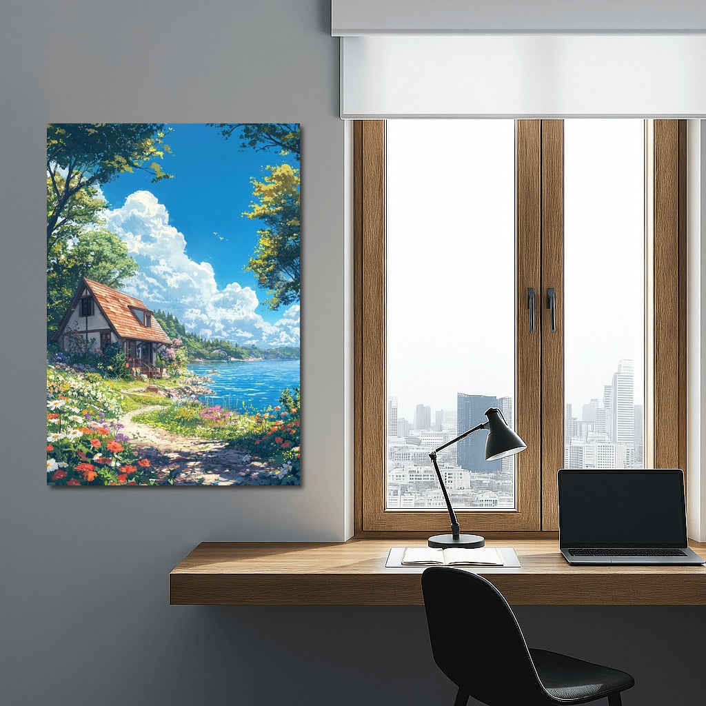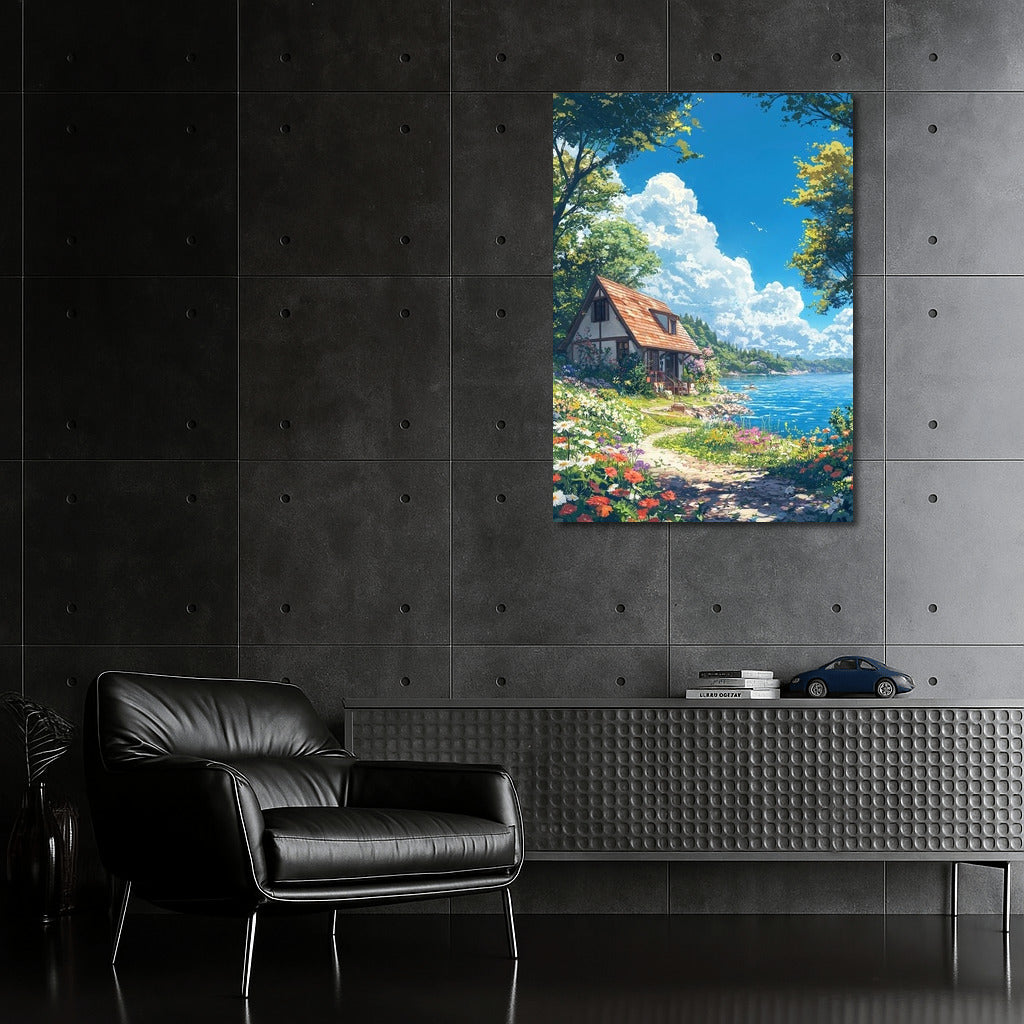 Sunny idyll: poster landscape with a house by the lake surrounded by flowers. Attractive wall art for coziness and inspiration. See more from the collection: Anime & Manga genres Art